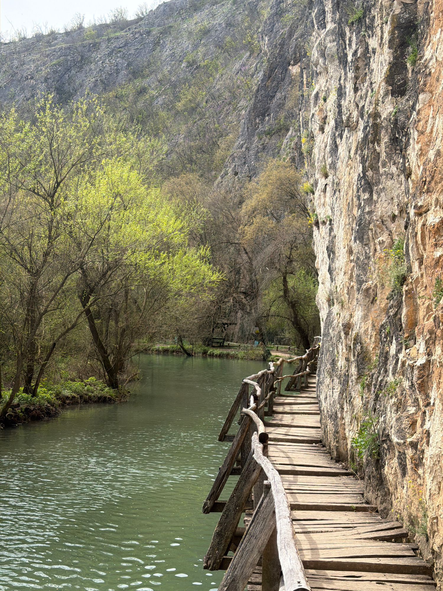 A landscape photograph, taken in Petrevene, Bulgaria, depicts a wooden bridge running along a cliffside adjacent to a body of water. The cliff face, composed of layered rock formations, rises vertical…read more