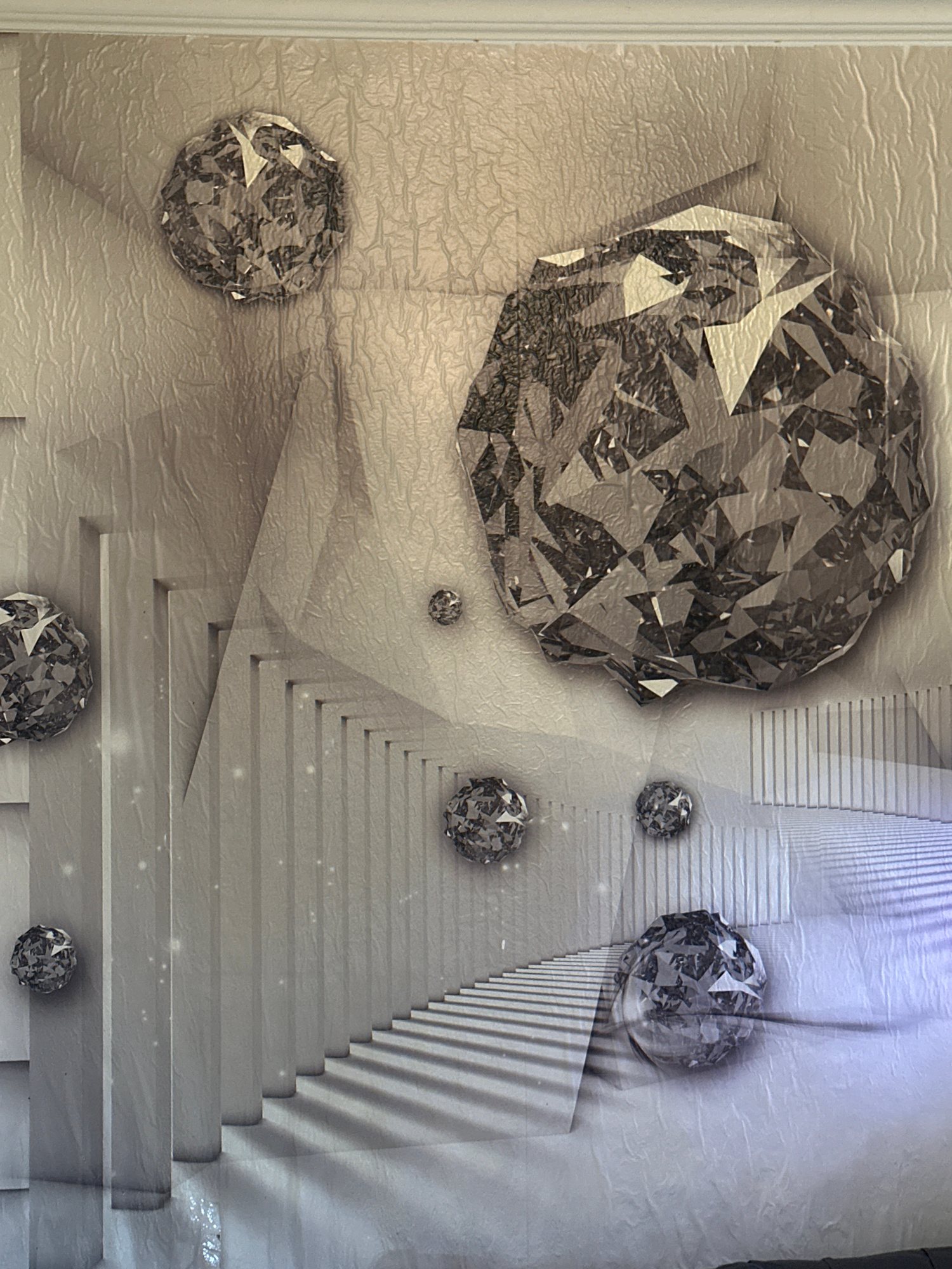 The image depicts a decorative wall covering or poster, likely indoors. The background appears to be a textured, beige or light gray surface with a subtle pattern reminiscent of crumpled paper or fabr…read more