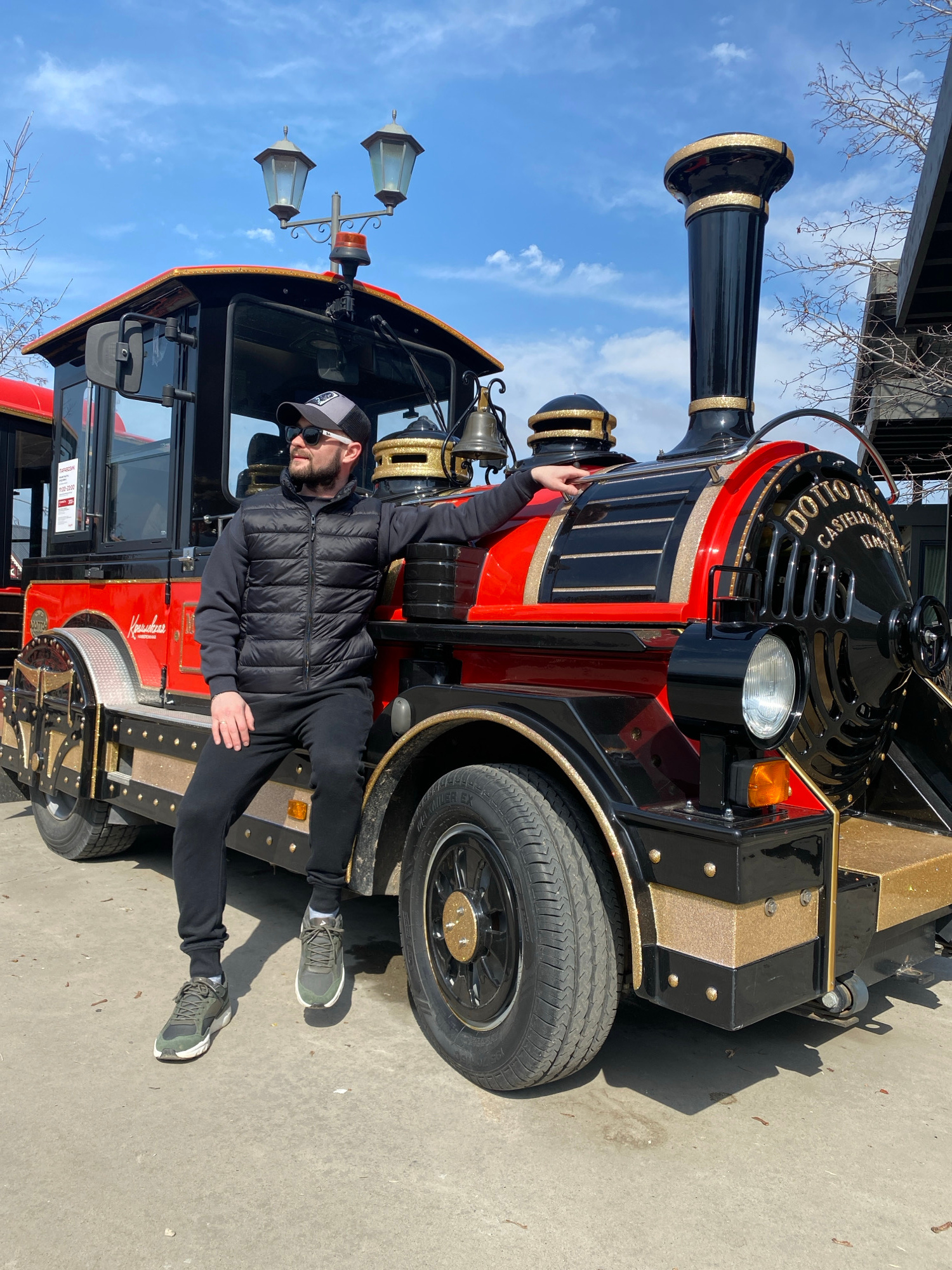 A man is posing with a decorative train-like vehicle. The man is wearing a black vest, black pants, a baseball cap, and sunglasses. He is leaning against the front of the vehicle with his right hand t…read more