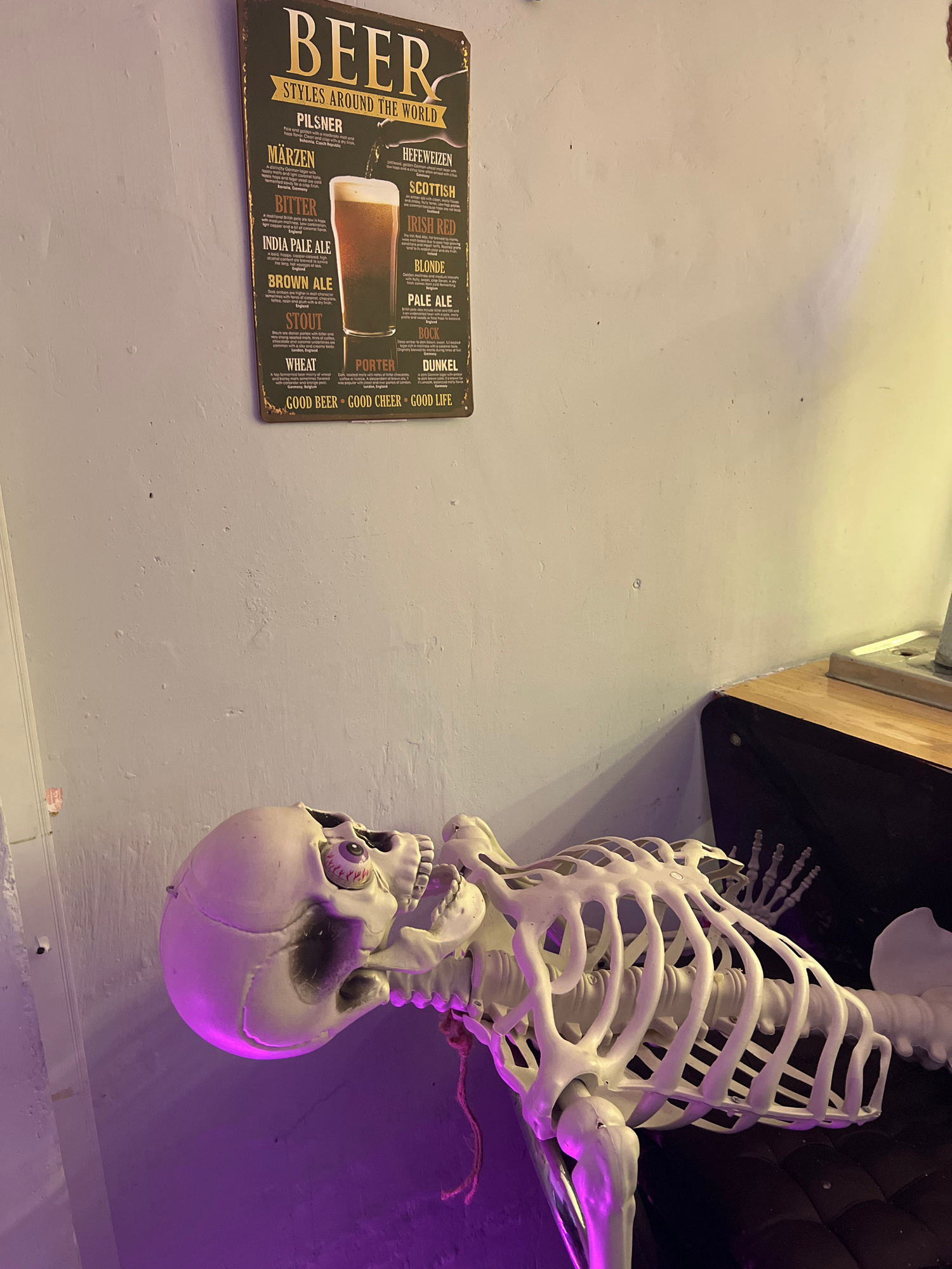 A sign about beer styles is mounted on a light-colored wall next to a hanging plastic skeleton in what appears to be a business. The beer sign is horizontal and has a dark background. The plastic skel…read more
