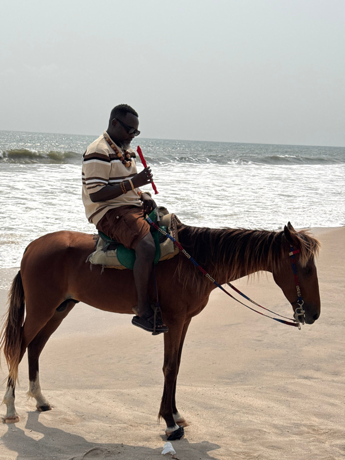 A male individual is depicted seated astride a brown horse on a sandy beach in Mopo Onijebu, Nigeria. The man, characterized by dark skin, short dark hair, and a beard, wears dark sunglasses, a light-…read more