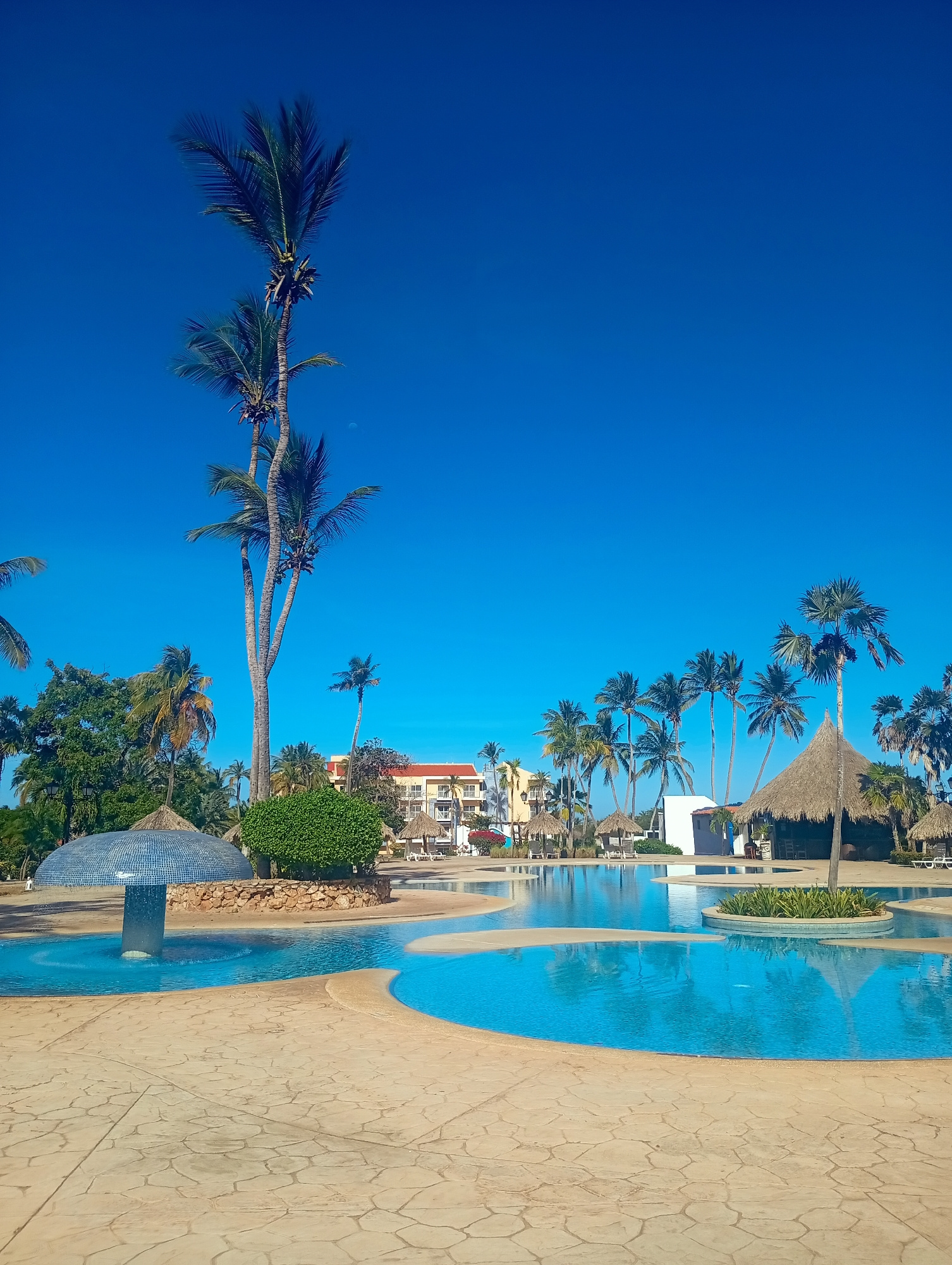The image displays an outdoor resort swimming pool area in Playa El Agua, Venezuela, under a clear, deep blue sky where a faint, circular moon is visible in the upper mid-left. The foreground is domin…read more