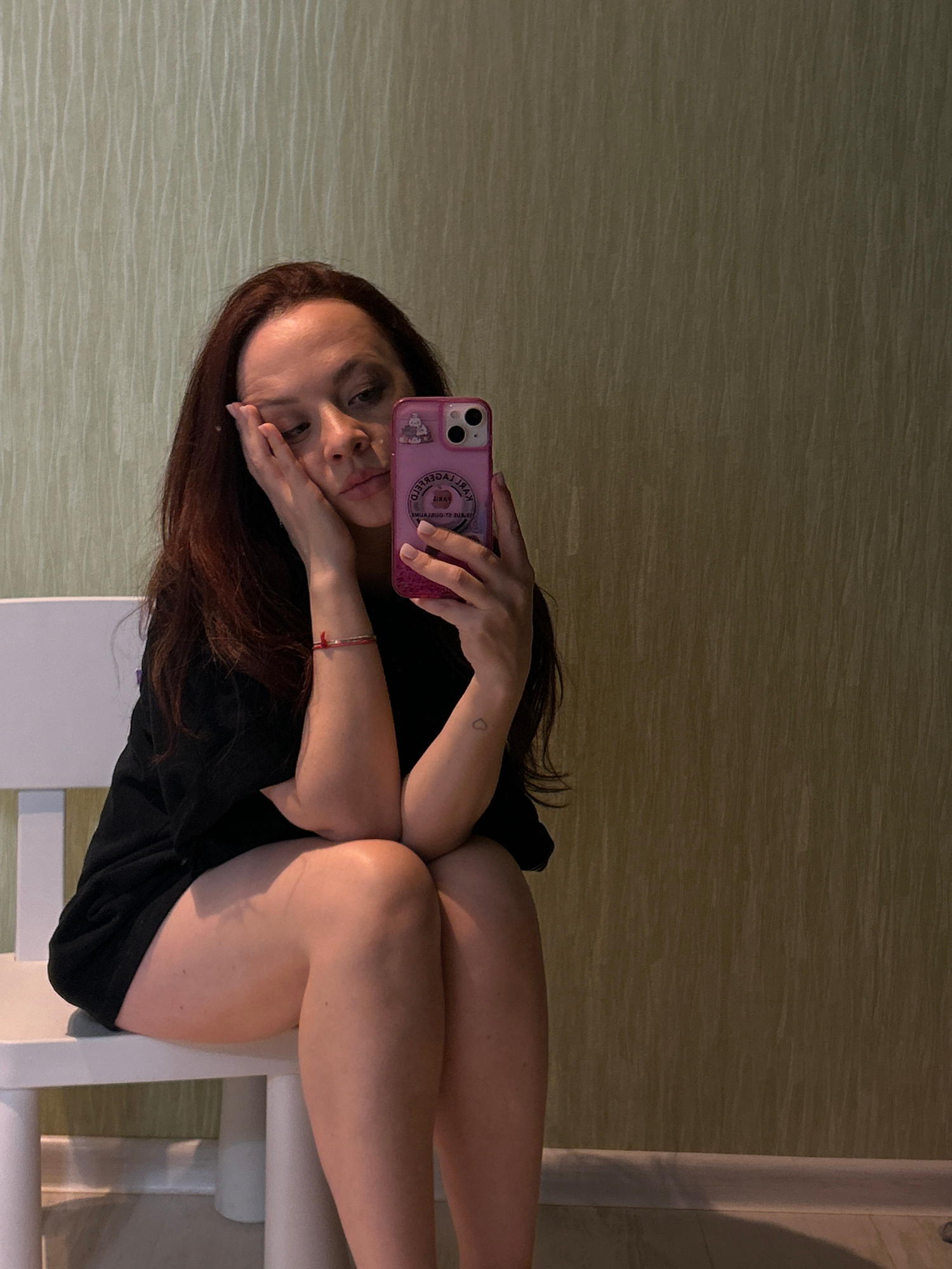 A woman is taking a selfie while sitting on a white chair or structure. She has long, dark brown hair and is wearing a black top. She is holding a pink phone case. The background appears to be a light…read more
