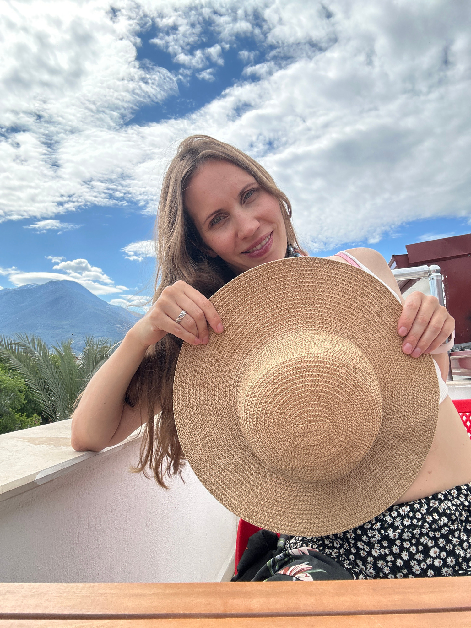 A woman with long brown hair and fair skin holds a large straw hat. She stands on a balcony. Behind her is a blue sky with white clouds, a mountain, and green trees. The woman wears a silver ring on h…read more