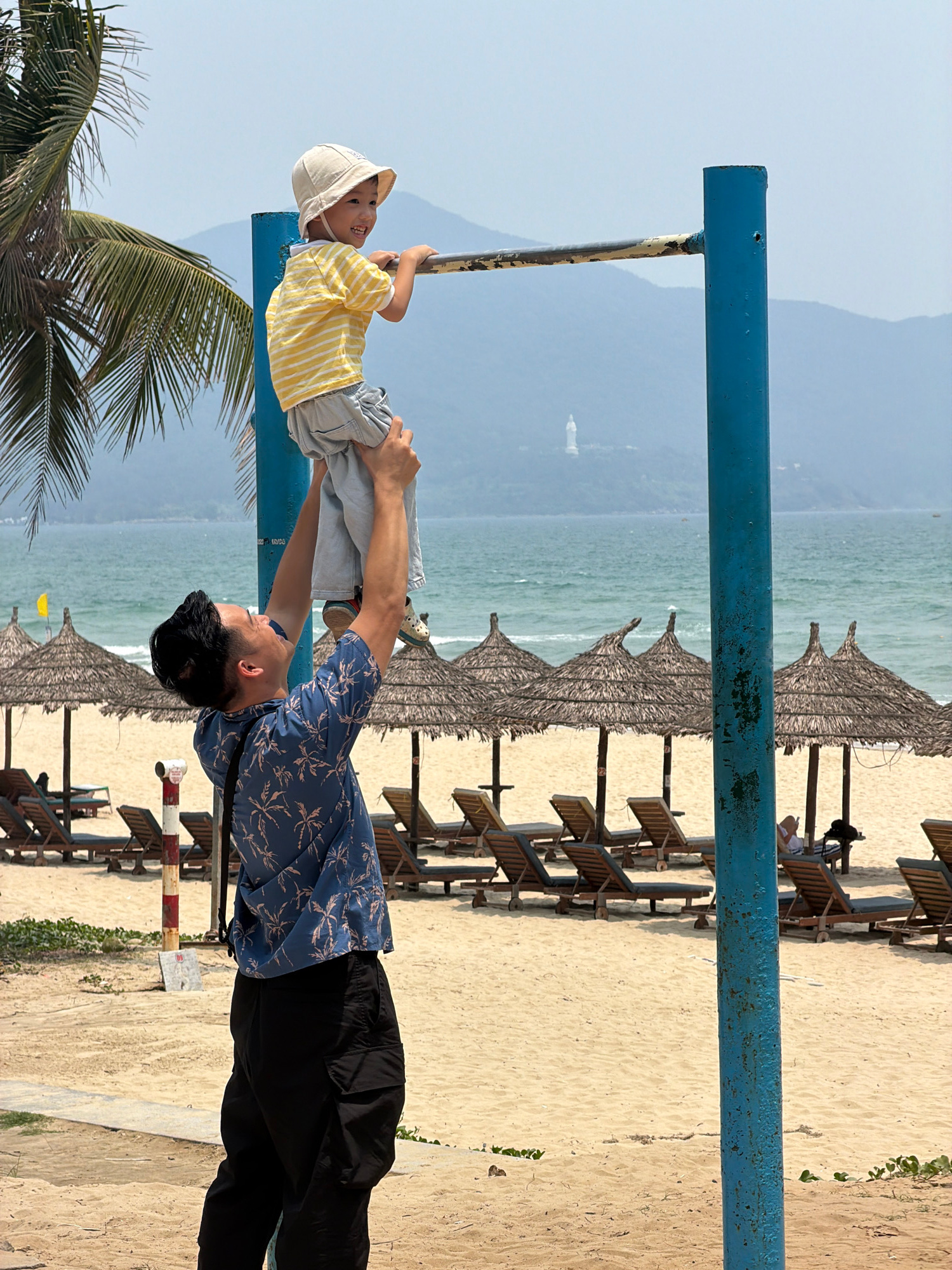 A medium shot features a man holding a small child hanging from a blue metal bar, with a beach scene as the background. The man has black hair and is wearing a blue shirt with a leafy pattern and blac…read more