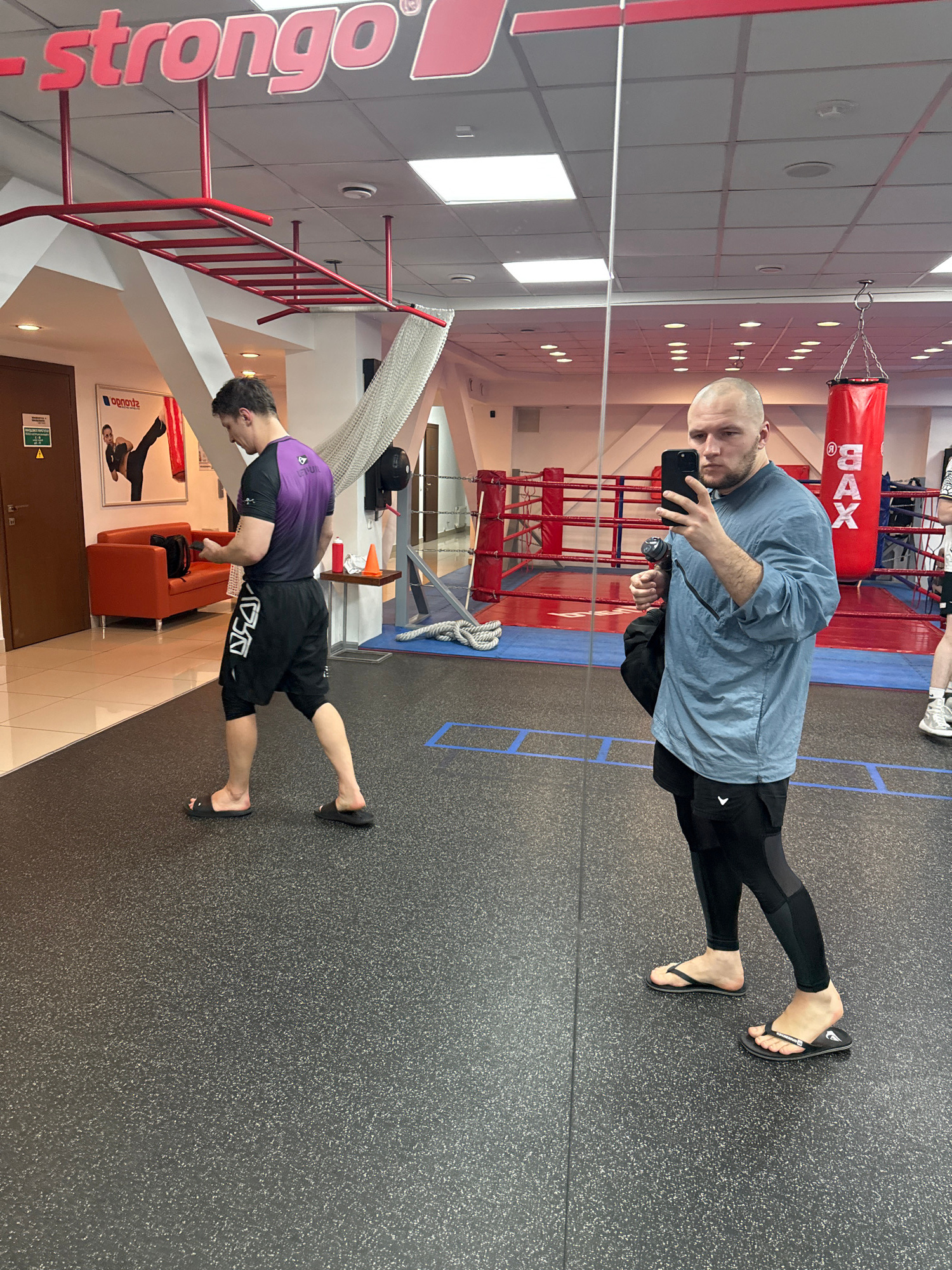 A mirror reflects a man holding a smartphone in a gym with a boxing ring, punching bag, and red metal fixtures. The man is balding, wearing a light blue shirt and black athletic pants with black flip-…read more