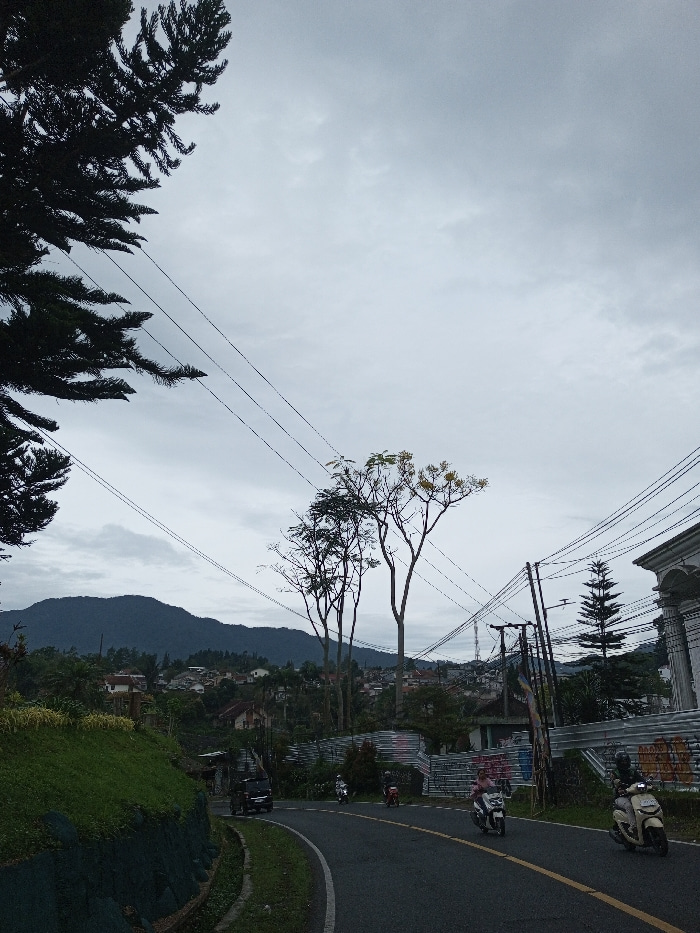 The scene depicts a curved asphalt road traversing a semi-urban, hilly environment in Adhanur, India, under an overcast sky. A prominent dark green coniferous tree frames the left side of the image. T…read more