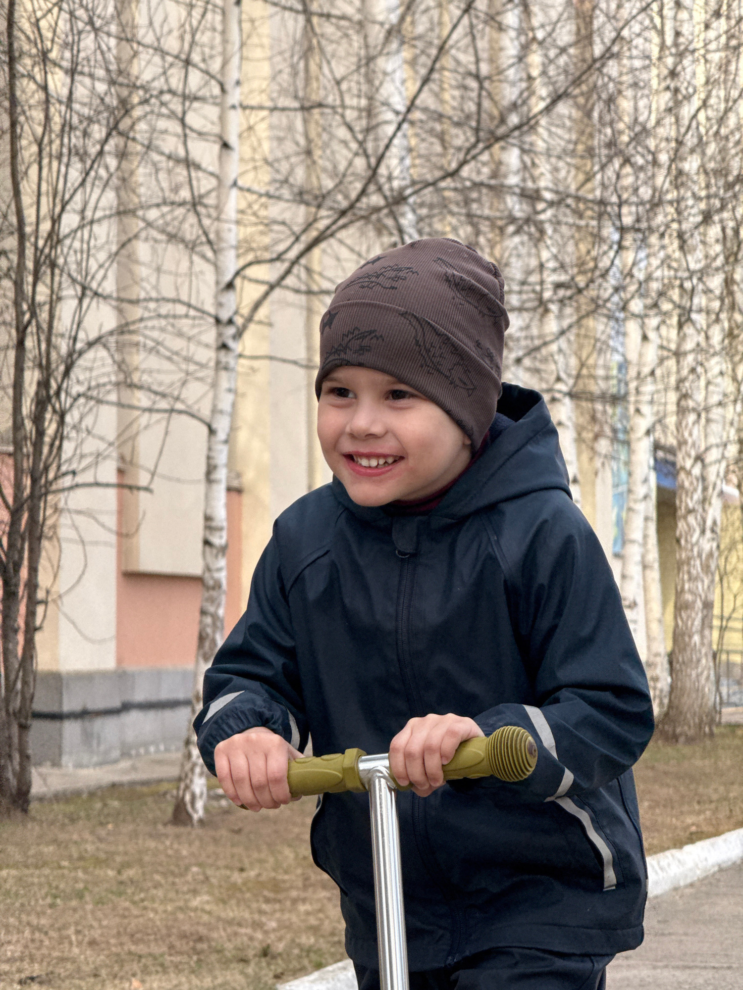 A close-up, slightly tilted portrait captures a young child, likely a boy, smiling broadly. He is wearing a dark blue hooded jacket with light grey reflective stripes on the sleeves and a brown knitte…read more