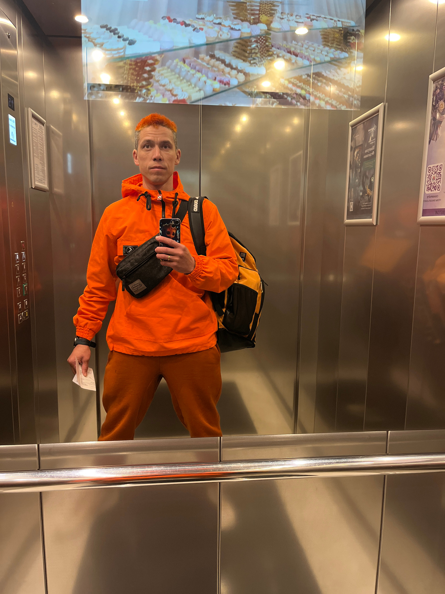 A man stands in an elevator. He is wearing an orange jacket and pants. He has orange hair. He is holding a cell phone in his right hand and a ticket in his left hand. He has a black shoulder bag acros…read more