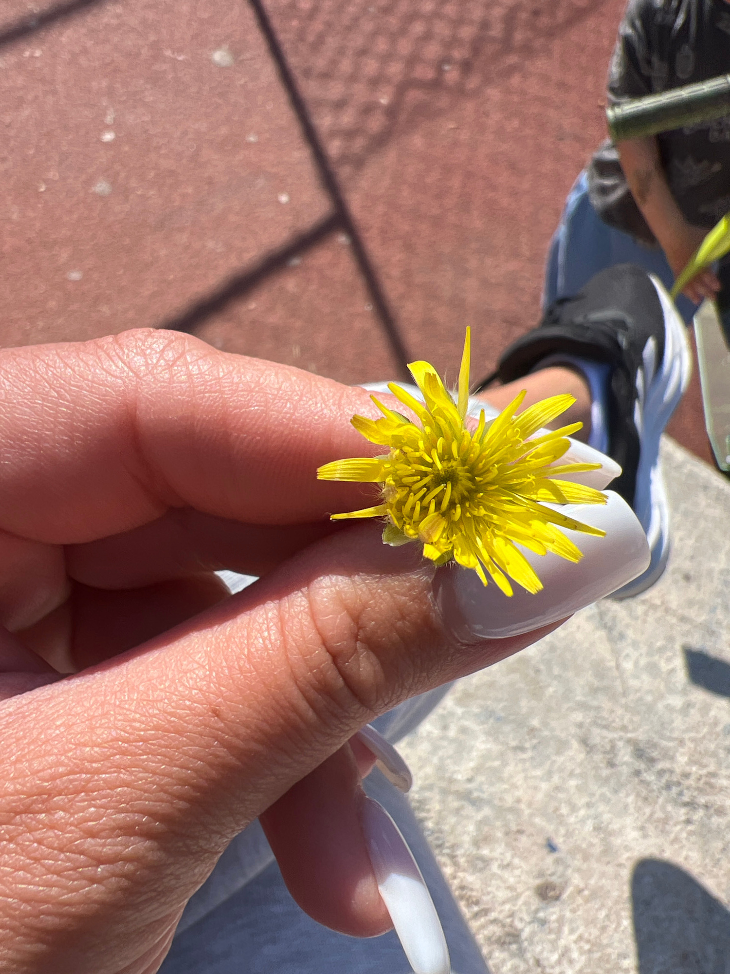 A hand is holding a bright yellow flower with many thin petals. The fingernails are long and painted white. The person is sitting outside, likely on a patio or sidewalk, as evidenced by the red brick-β¦read more
