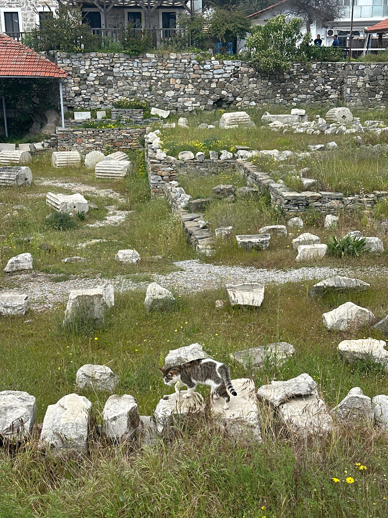 The image depicts an ancient ruin site in Bodrum, Turkey, overgrown with grass and wildflowers. Stone remnants, likely from columns and structures, are scattered across the landscape. A tabby cat is p…read more
