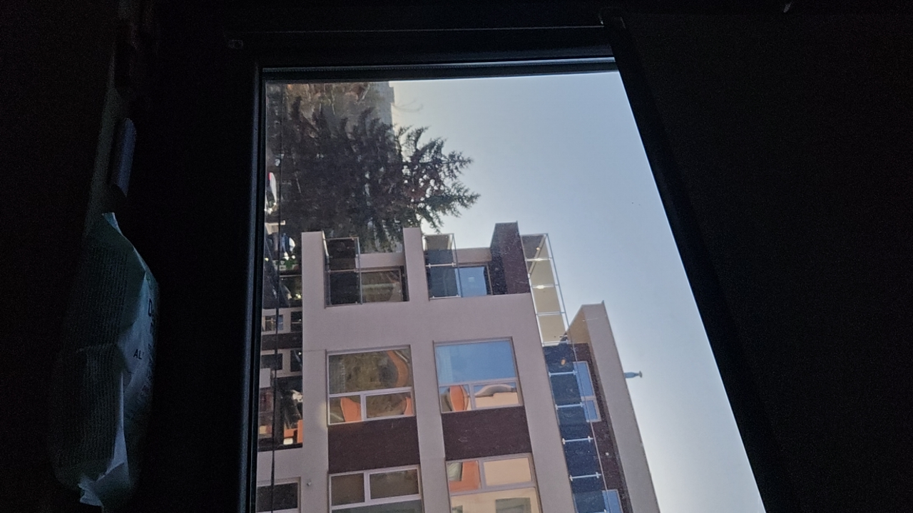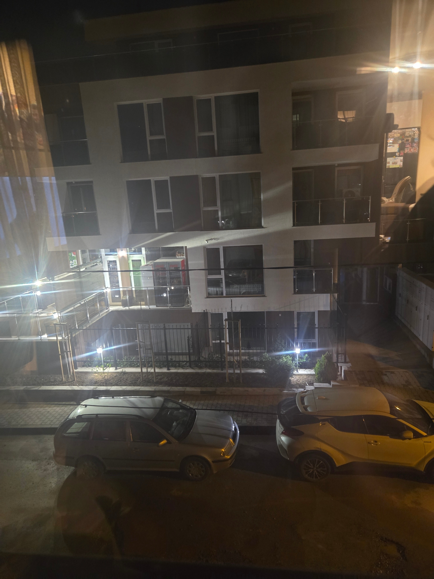 The image shows an exterior view of a modern apartment building at night in Sofia, Bulgaria. The building is multi-storied, with a facade of large windows. There are two cars parked along the side of…read more