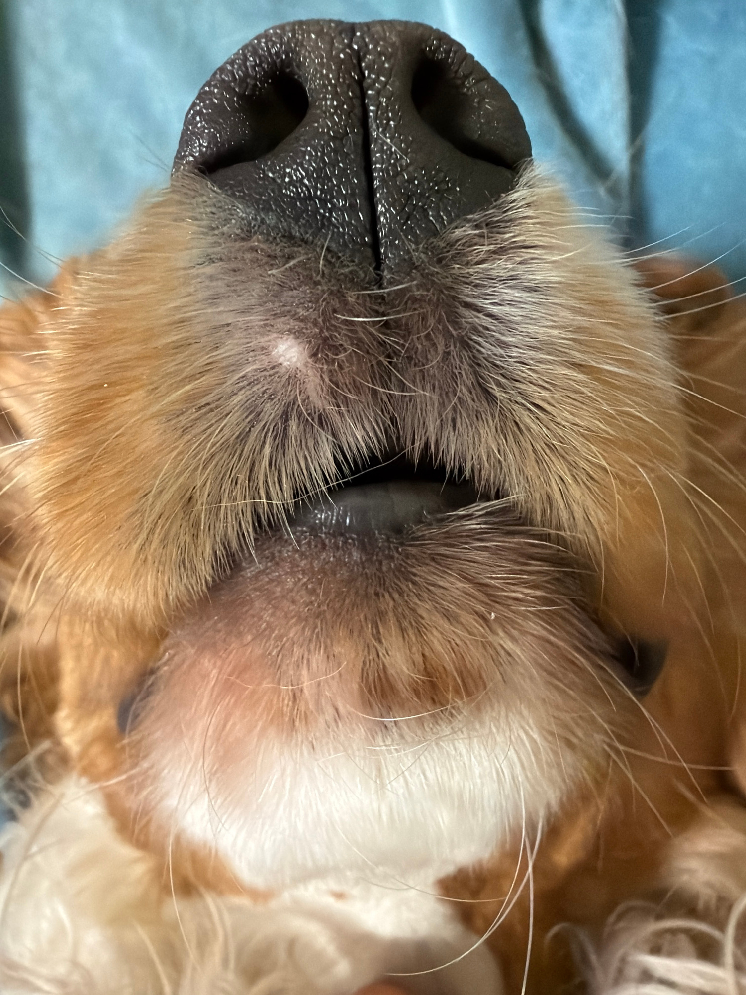 A close-up, slightly off-center image depicts the snout of a dog. The dog's nose is black, with visible nostrils and textured skin. Fur surrounds the nose, predominantly light brown and white. A few w…read more