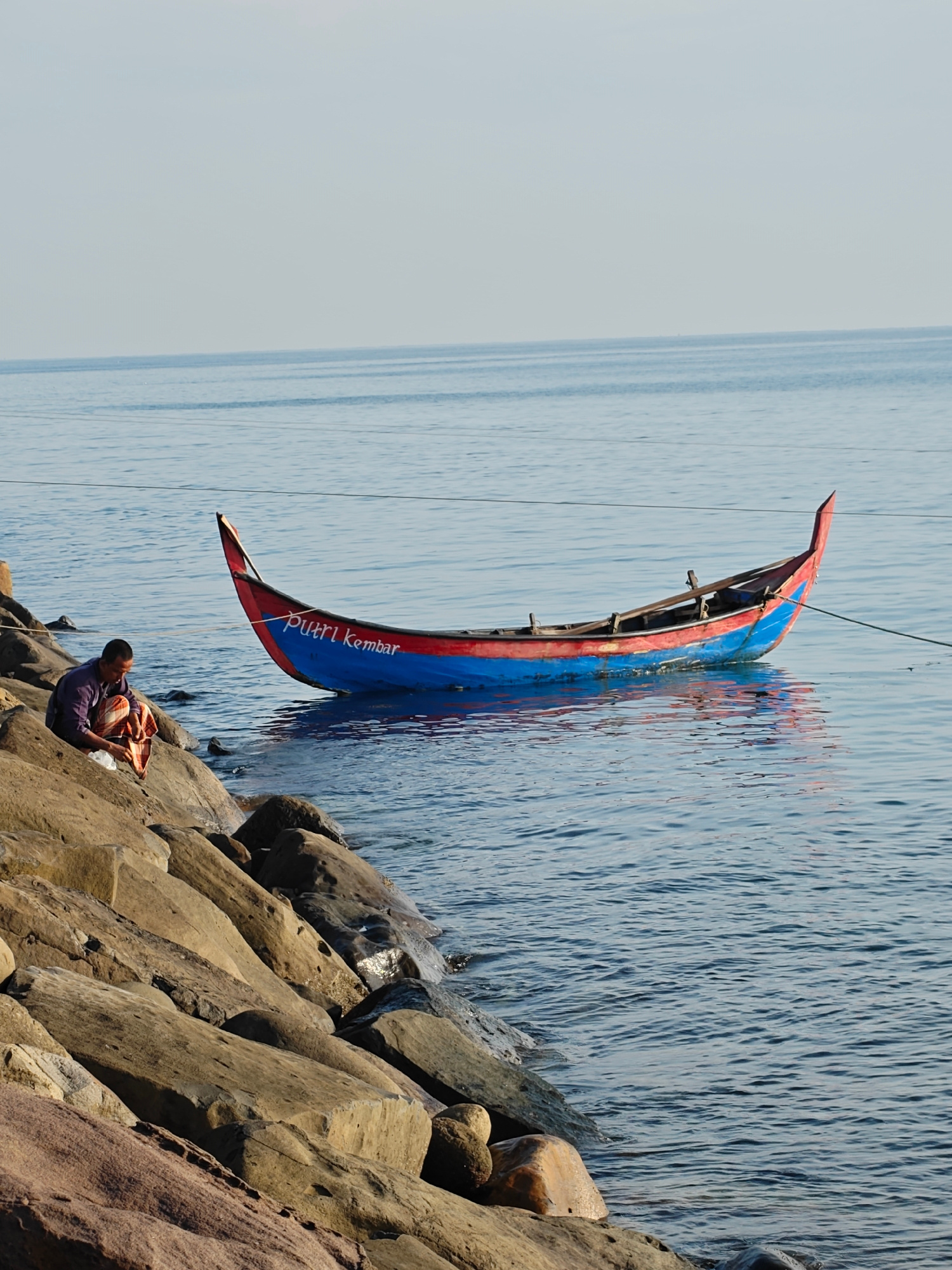 A clear day in Lhokseumawe, Indonesia, reveals a scene along the shore. A man is squatting near the edge of a rock formation, focused on an item in his hands, possibly food. To his right, a red and bl…read more