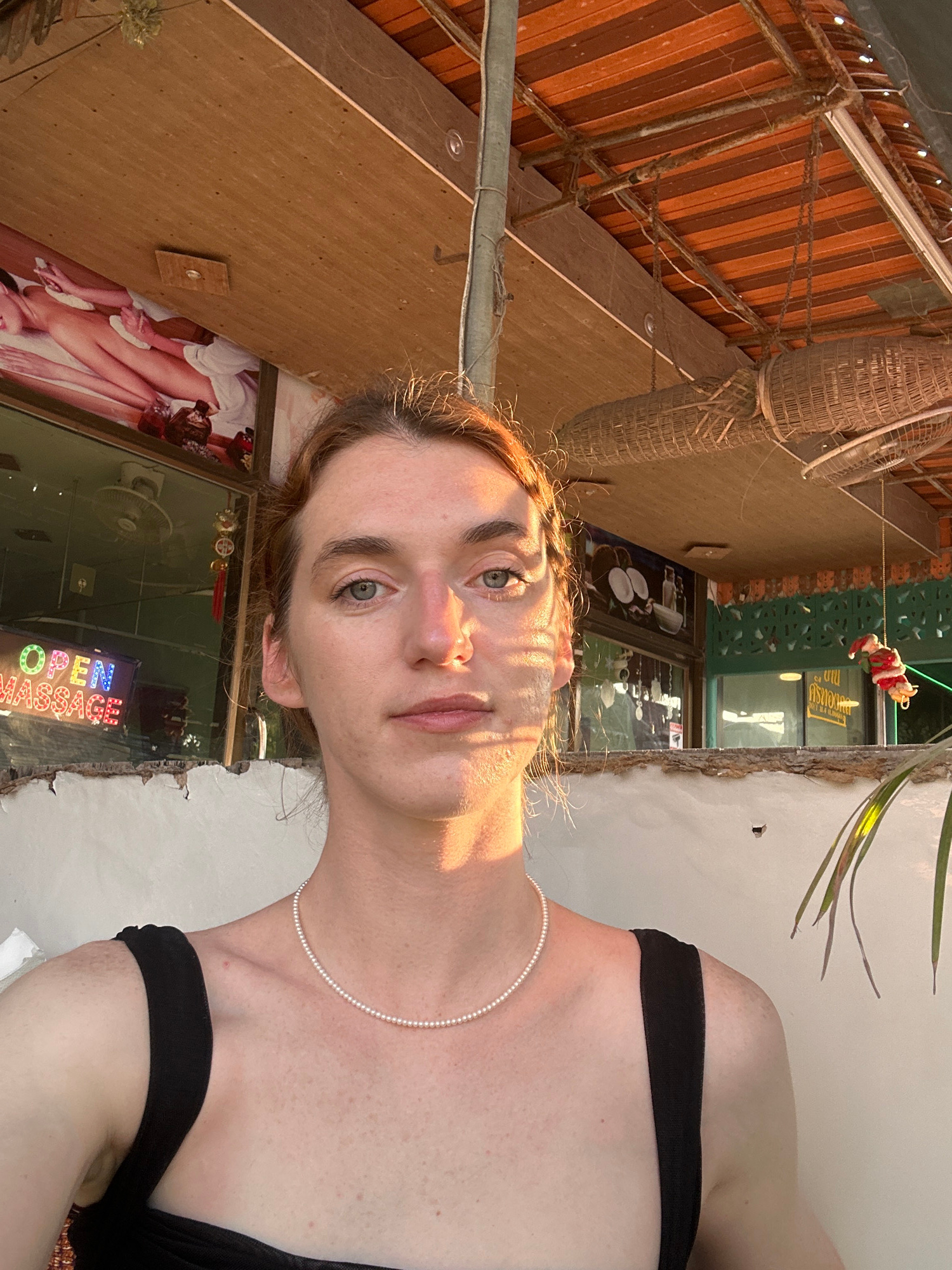 A selfie taken in Baan Bang Rak, Thailand shows a person with fair skin, light brown hair, and a pearl necklace wearing a black top. The person is in a pool. Behind them, there is a building with a si…read more