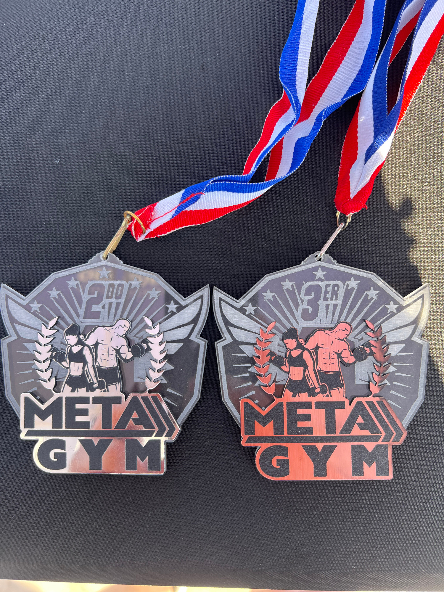 The image shows two medals, one indicating 2nd place and the other 3rd place, both for "Metal Gym." Each medal is attached to a red, white, and blue ribbon. The medals are resting on a dark, possibly…read more