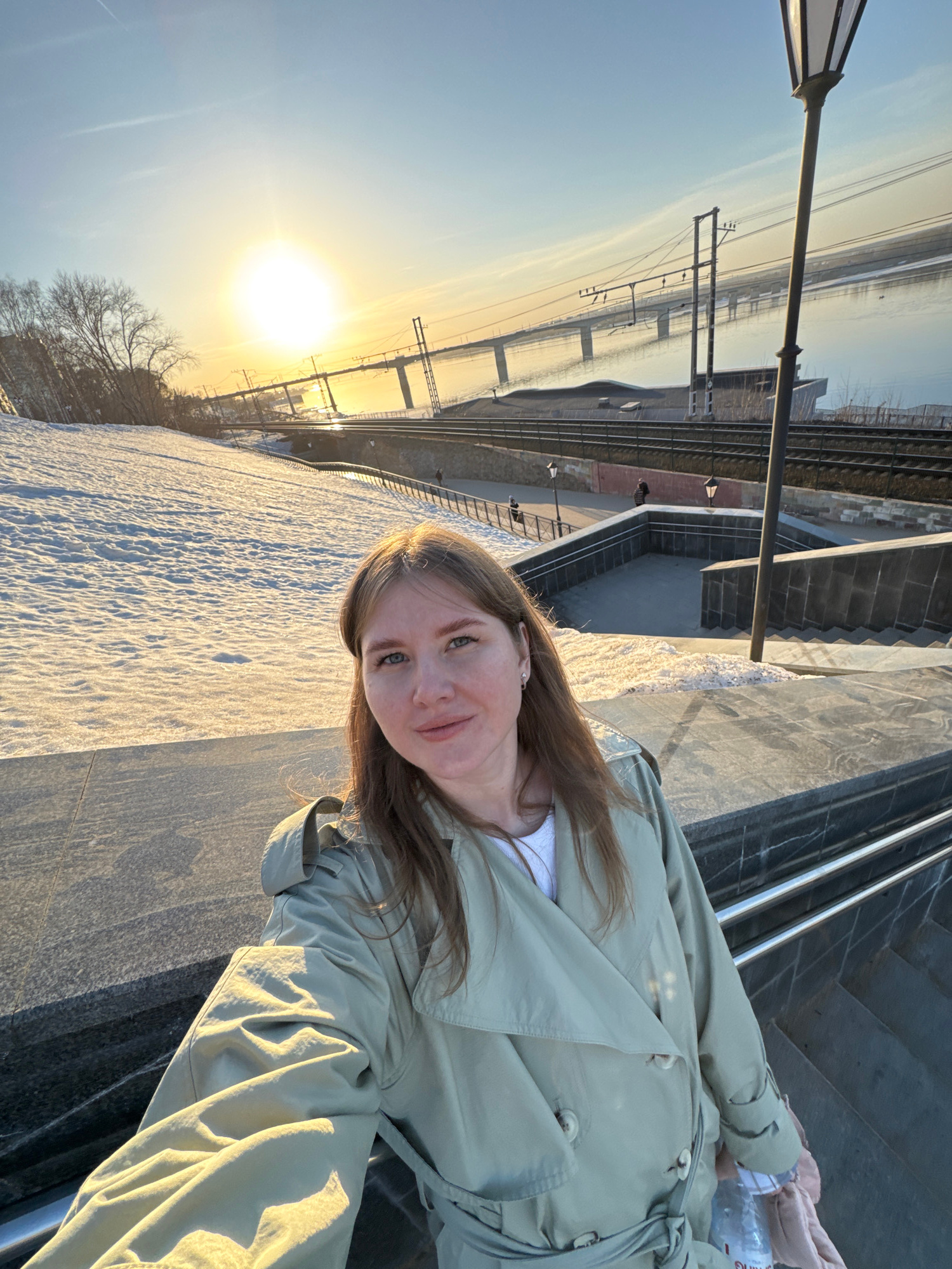 A woman with fair skin, light brown hair, and blue eyes is standing on a snow-covered surface, likely a walkway or platform. She is wearing a light green trench coat and a white shirt underneath. The…read more