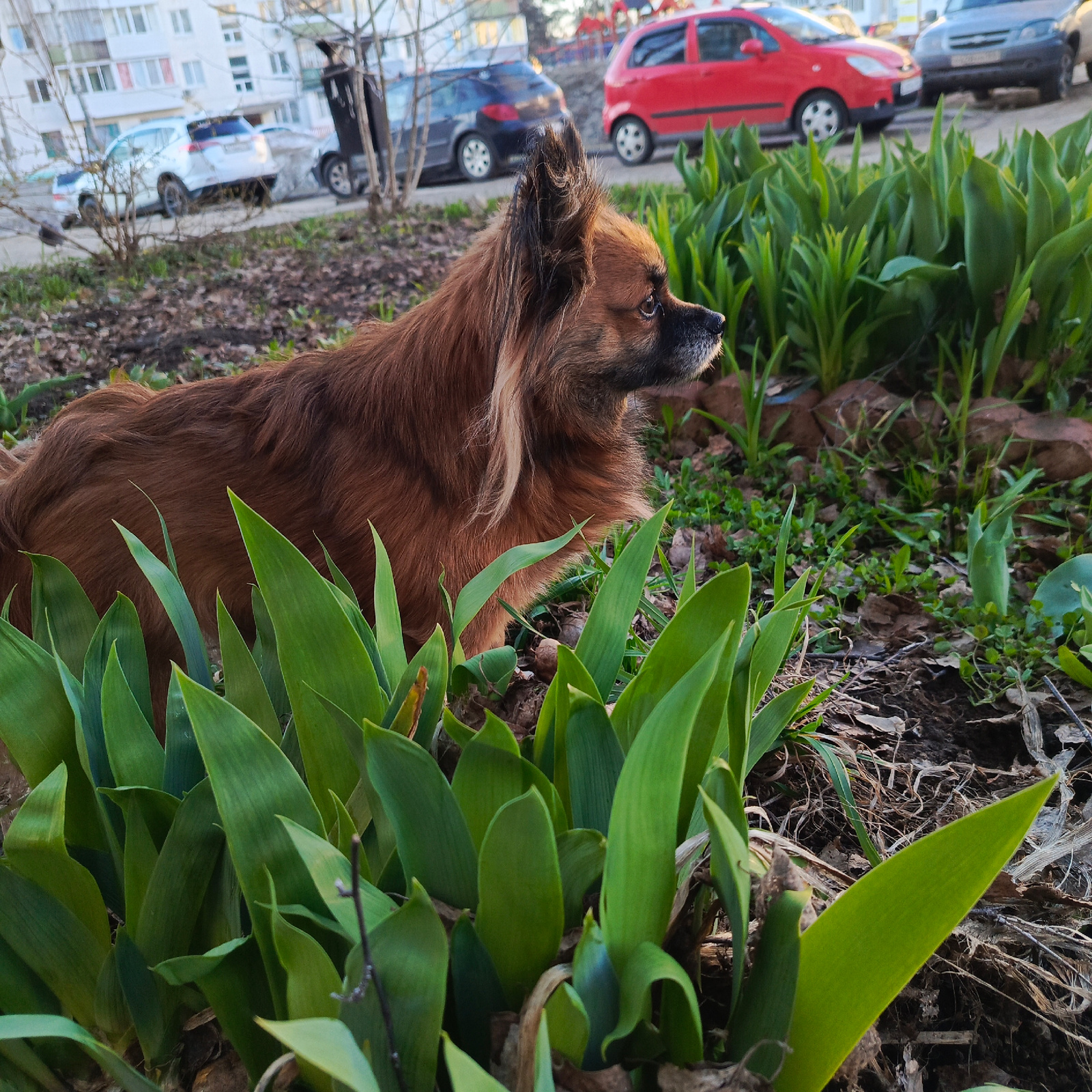 A medium-sized, long-haired brown dog with a graying muzzle stands amidst a patch of green, leafy plants, likely tulips, in an urban environment. The dog faces to the right of the frame. In the backg…read more