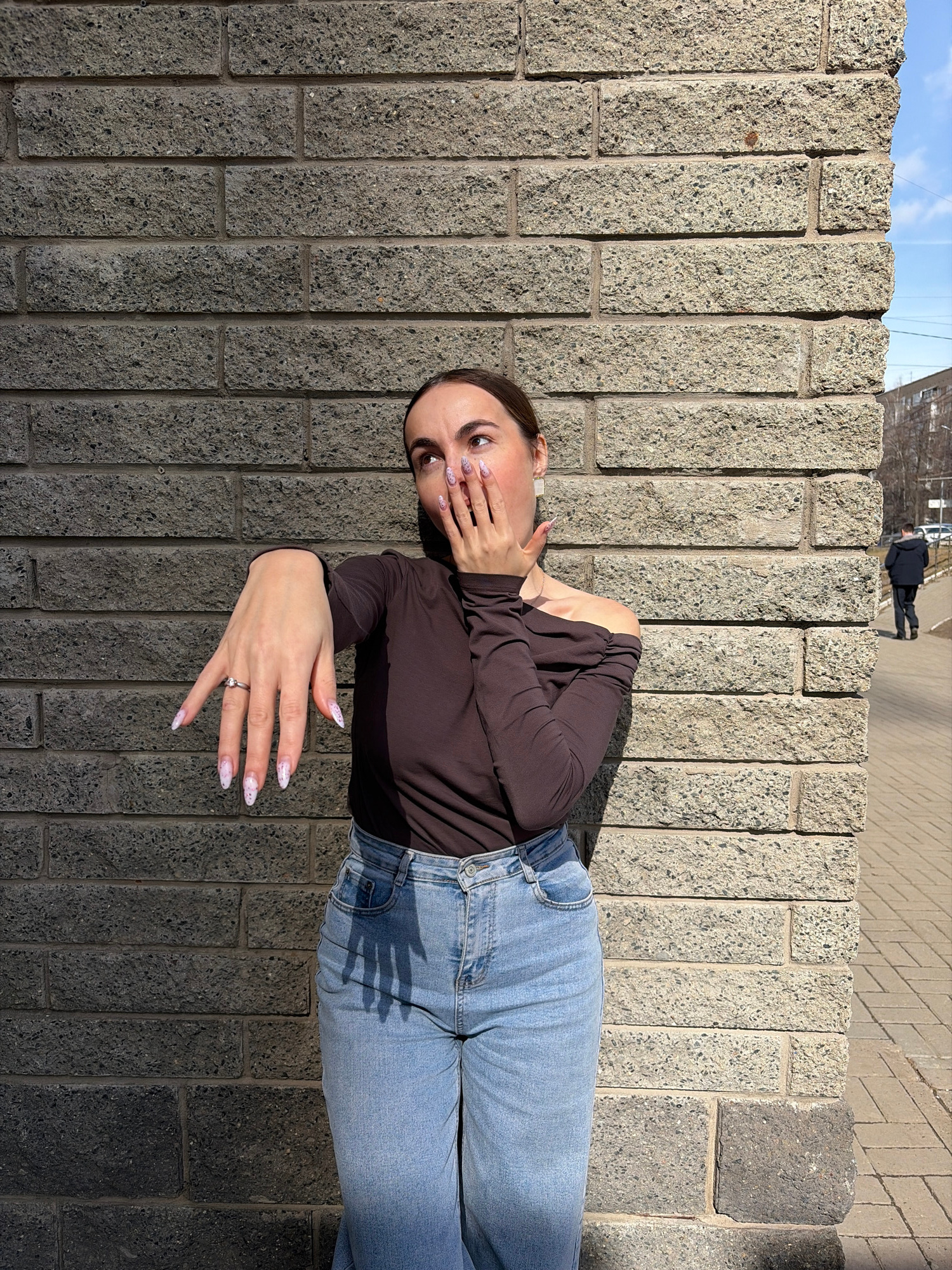 A woman wearing a brown long-sleeve shirt and blue jeans is standing next to a concrete block wall on a sunny day. She has light skin, dark hair pulled back, and light-colored nail polish with speckle…read more