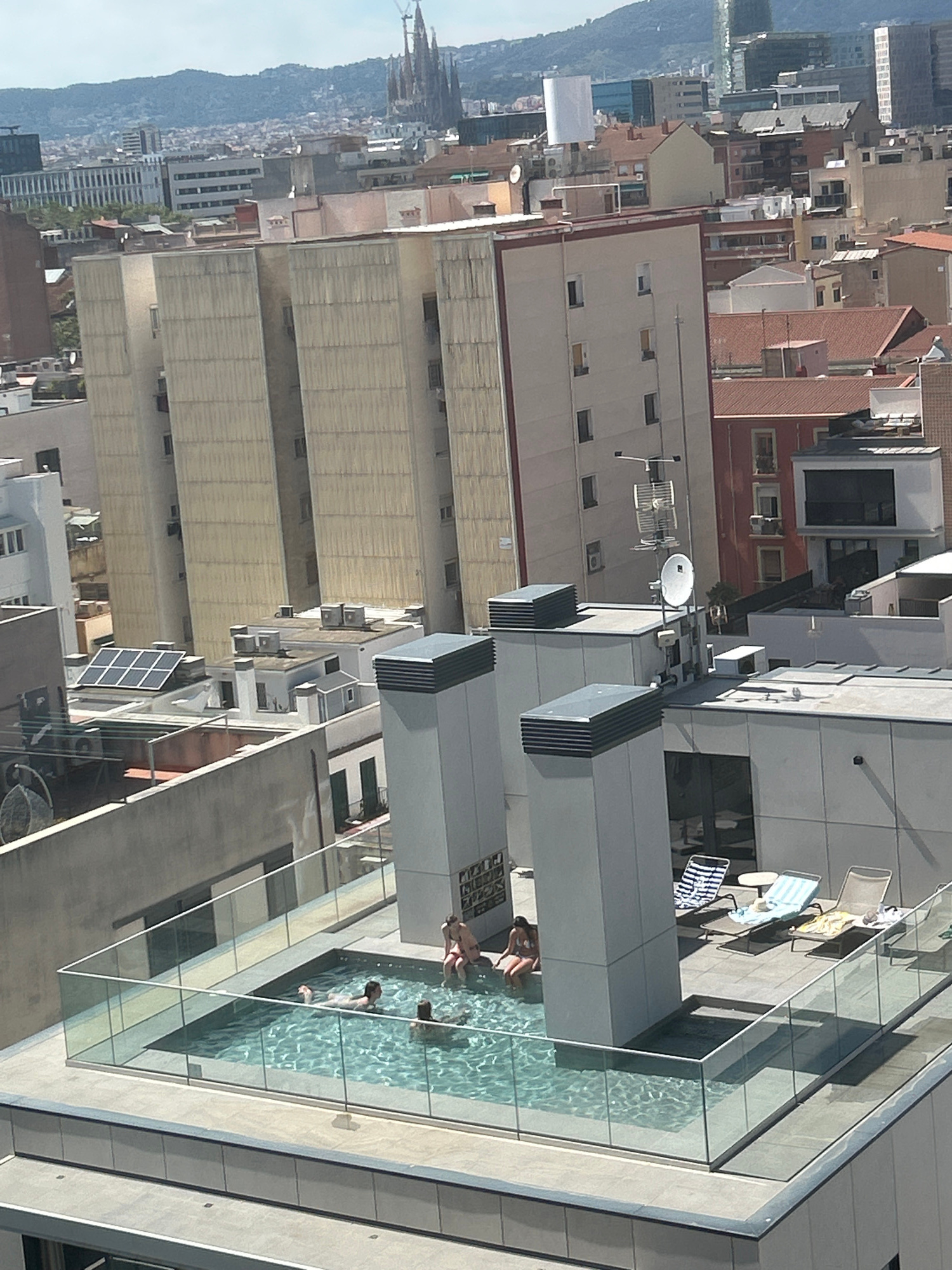 The image shows an aerial view of Barcelona, Spain, with a focus on a rooftop pool. Several people are in the pool. On the pool deck are lounge chairs. In the background, the city's architecture, incl…read more