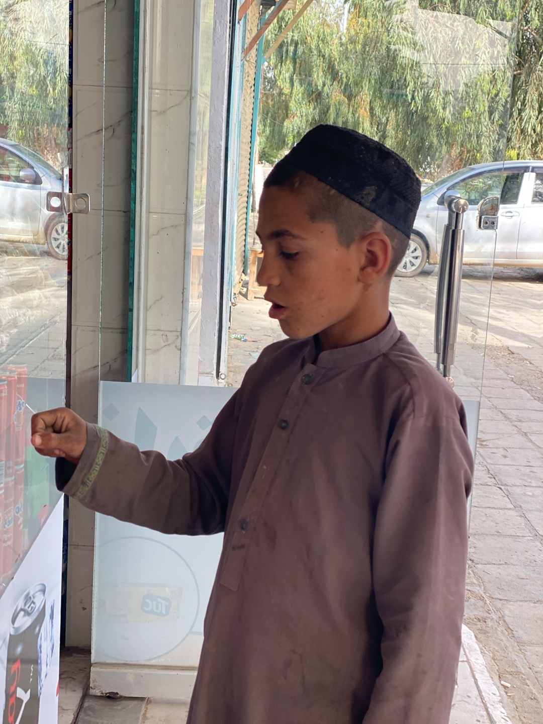 A young boy, possibly of Afghan descent, stands outside a shop in what appears to be an urban setting. The location is potentially Kandahar, Afghanistan. He is wearing a dark-colored skullcap and a br…read more