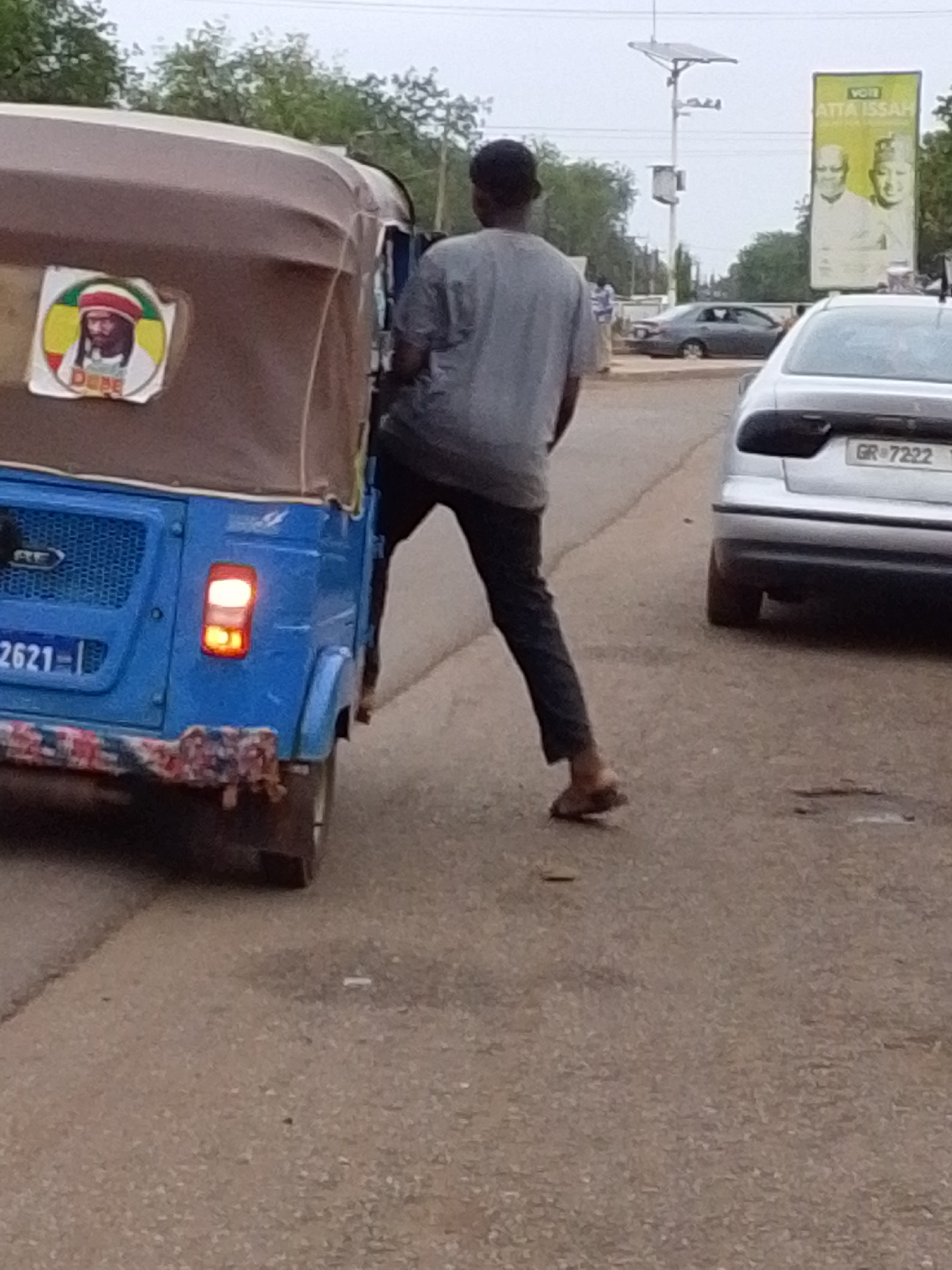 The image shows a street scene in Tamale, Ghana. In the foreground, a man in a grey shirt, dark pants, and sandals is climbing onto a blue "tuk-tuk" or auto-rickshaw. The tuk-tuk has a picture of a pe…read more