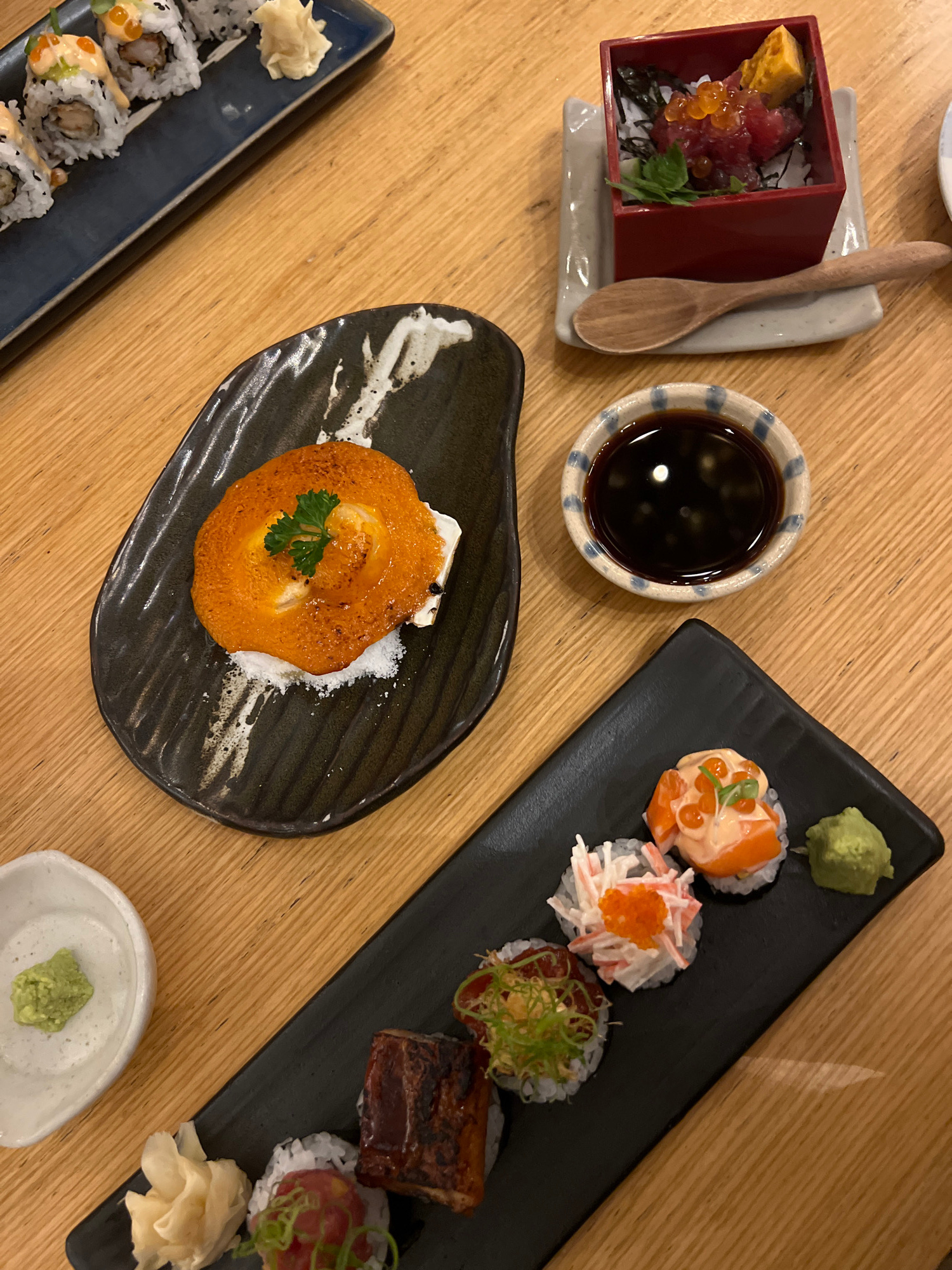 The image shows a high-angle, close-up view of a table arrangement of Japanese cuisine. There are several plates with sushi and related dishes on a light-colored wooden table. On the left, a dark blu…read more