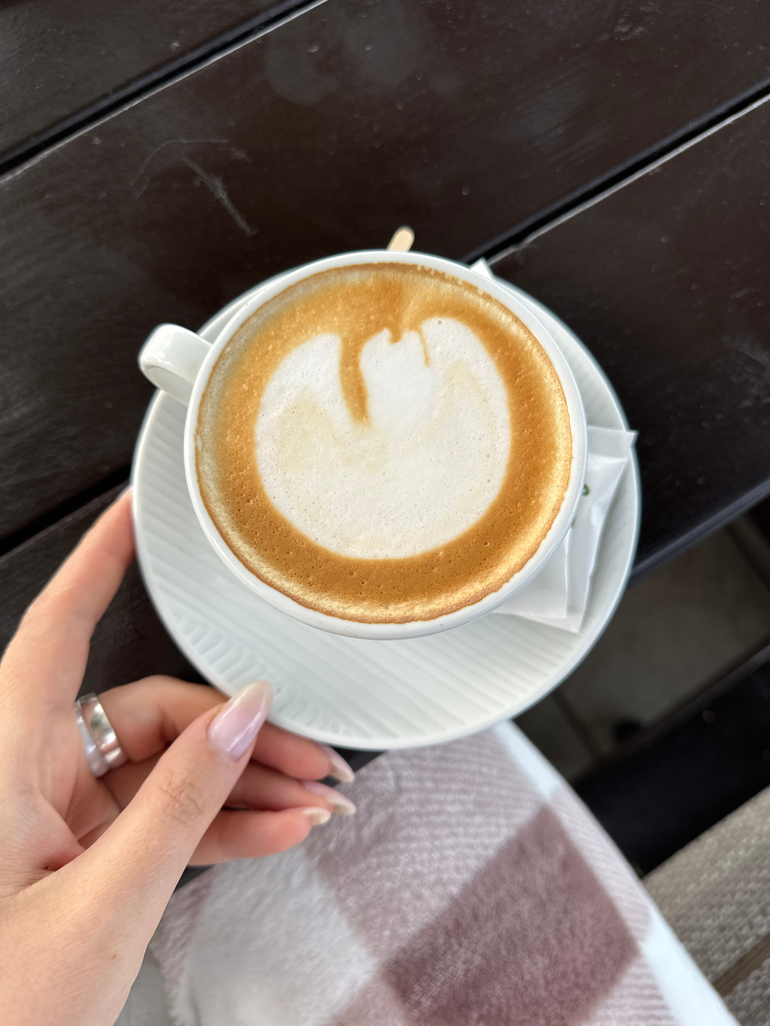 A cappuccino sits in a white cup on a matching saucer atop a dark brown wooden table. A hand, adorned with a silver ring and long nails, rests near the saucer. A beige and white plaid blanket is parti…read more