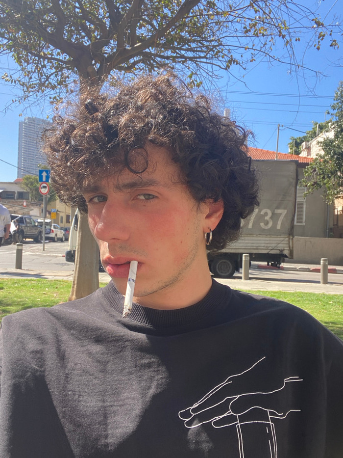 A young male subject with curly dark hair and light eyes is depicted in a close-up, outdoors. He wears a black long-sleeved sweatshirt featuring a white line drawing of a hand. A lit cigarette, with a…read more
