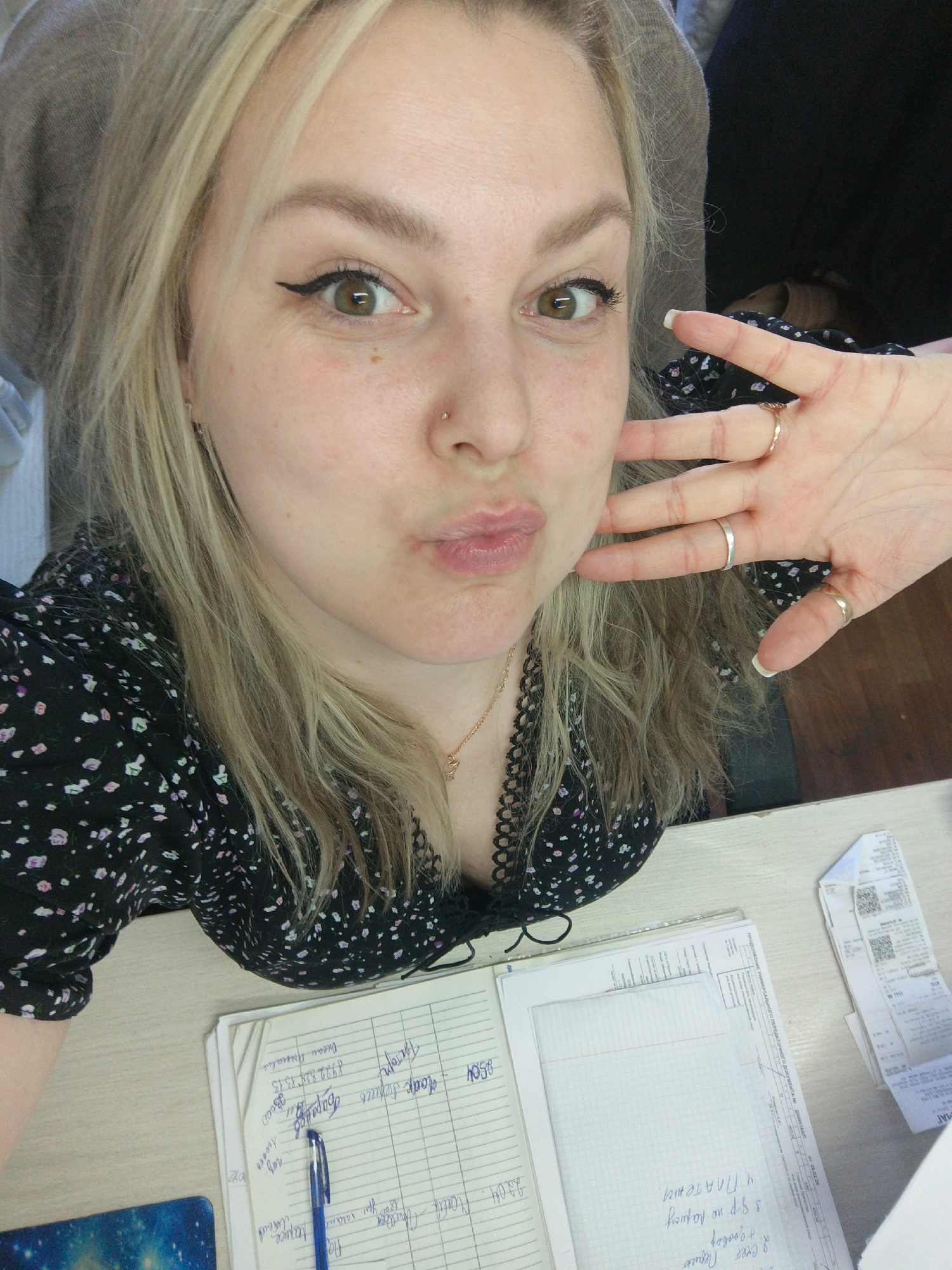 A selfie of a fair-skinned blonde woman with green eyes and a nose piercing, wearing a black floral print top, at a desk. The woman is puckering her lips and holding up her hand which has multiple rin…read more