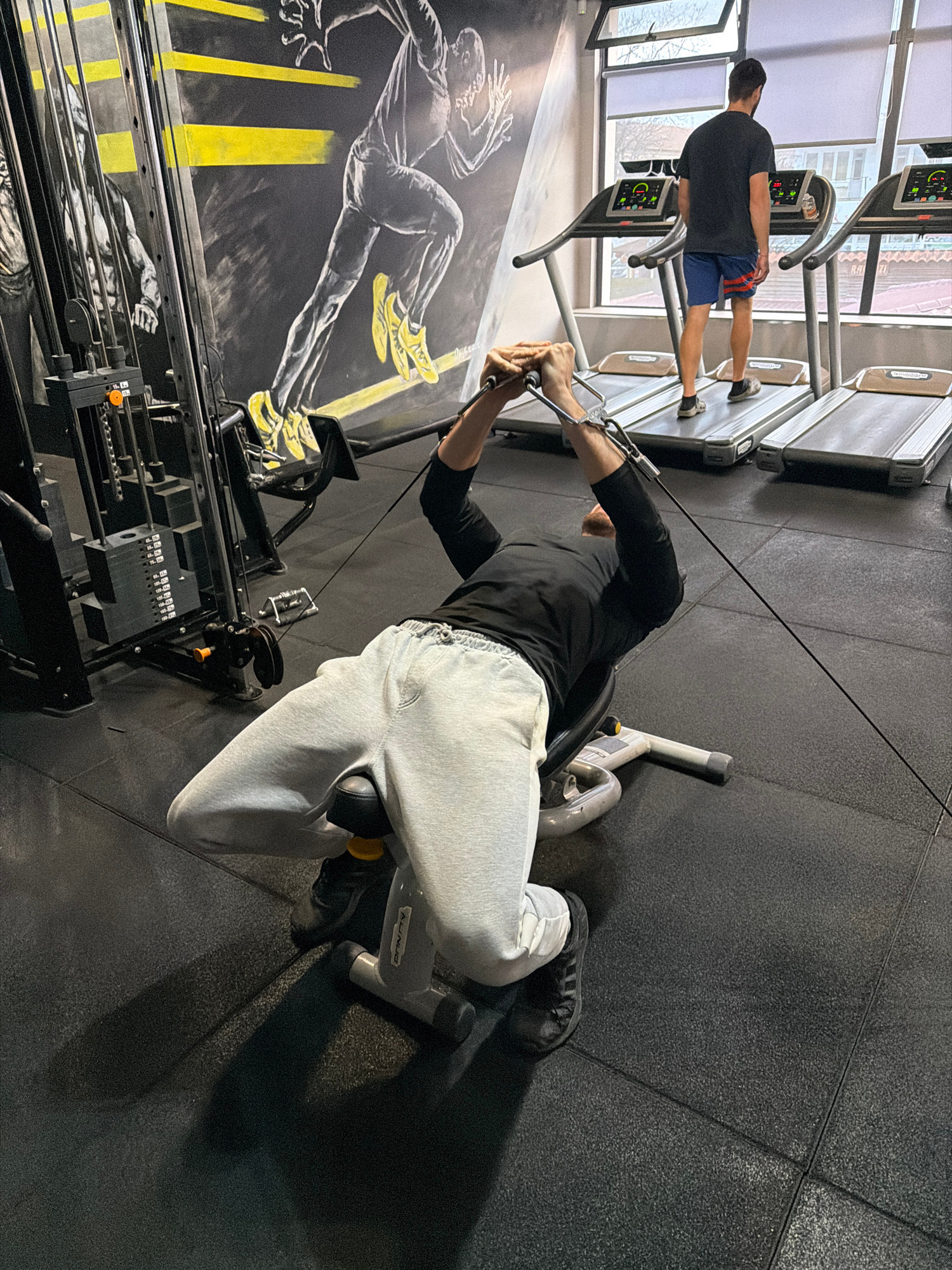A gym interior is presented with a view angled slightly downward. In the foreground, a person wearing a black long-sleeved shirt and grey sweatpants is seated on a machine and pulling on a cable attacβ¦read more