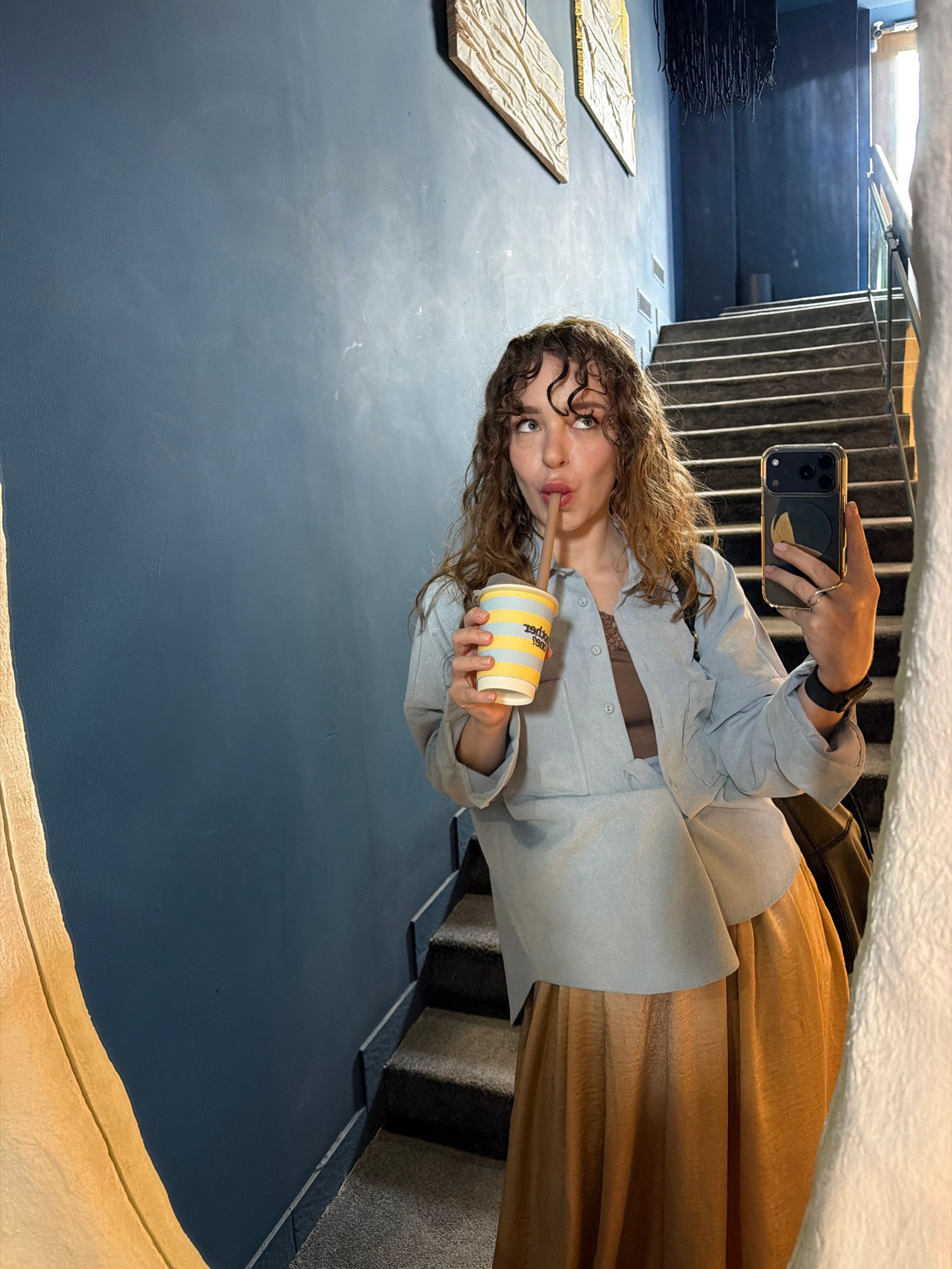 A young woman captures a selfie reflected in a mirror or highly polished surface within a contemporary indoor setting. She has long, curly, light brown hair and is seen from the chest up. She wears a…read more