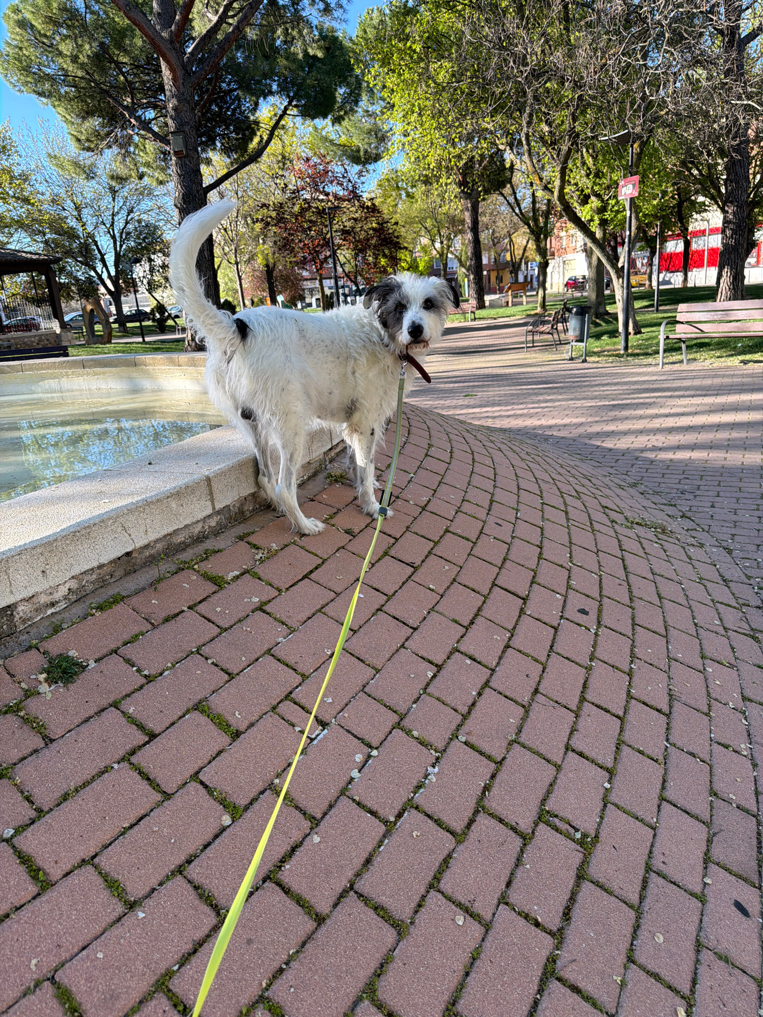A full body shot of a medium-sized white dog with black markings is captured outdoors on a sunny day in Azuqueca de Henares, Spain. The dog has a leash attached and appears to be standing near a stone…read more