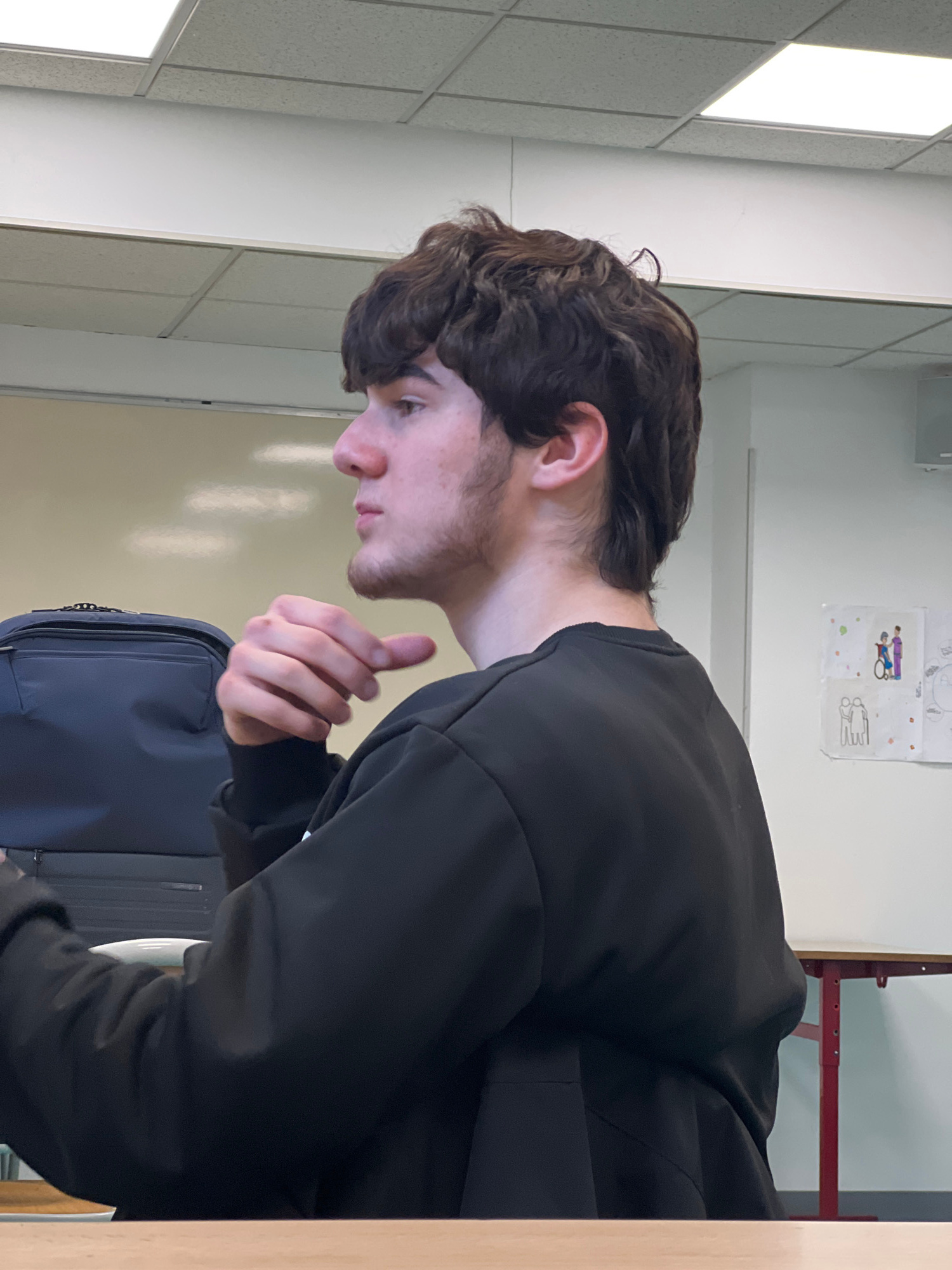 A person with dark, curly hair and a beard is facing left, looking down with a pensive expression. They are wearing a black long-sleeved shirt. The person appears to be holding a dark-colored backpack…read more