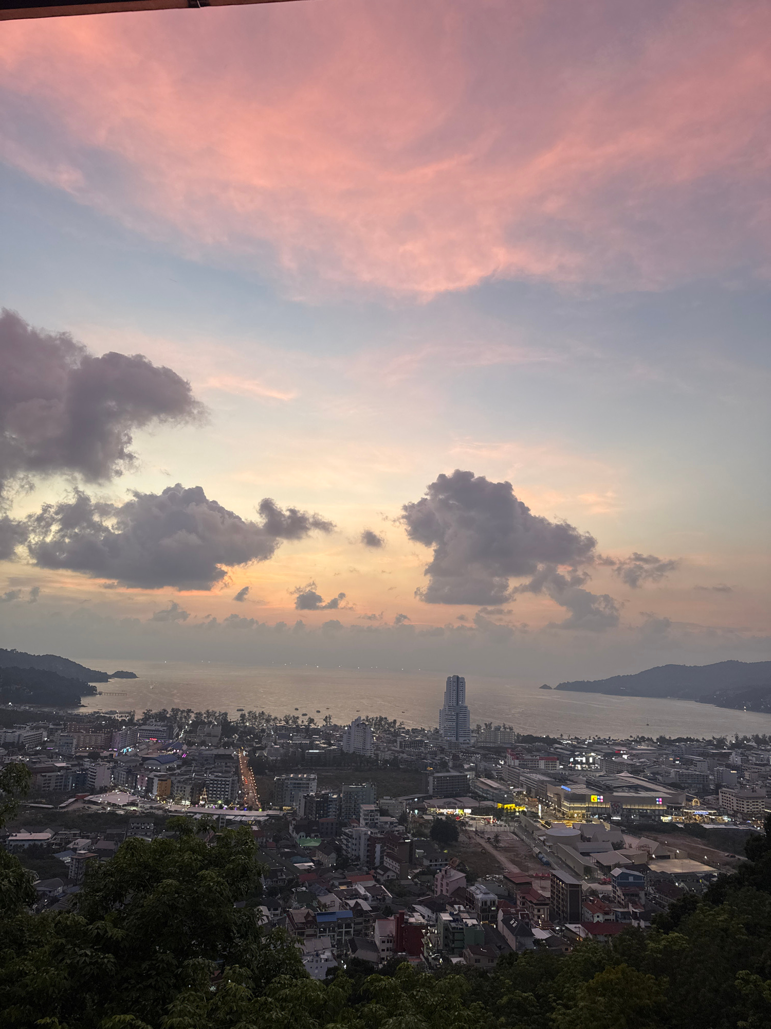 This media file presents an expansive, elevated panoramic view of Patong, Thailand, captured during the period of dusk or twilight. The photograph is taken from a high vantage point, likely a hillside…read more