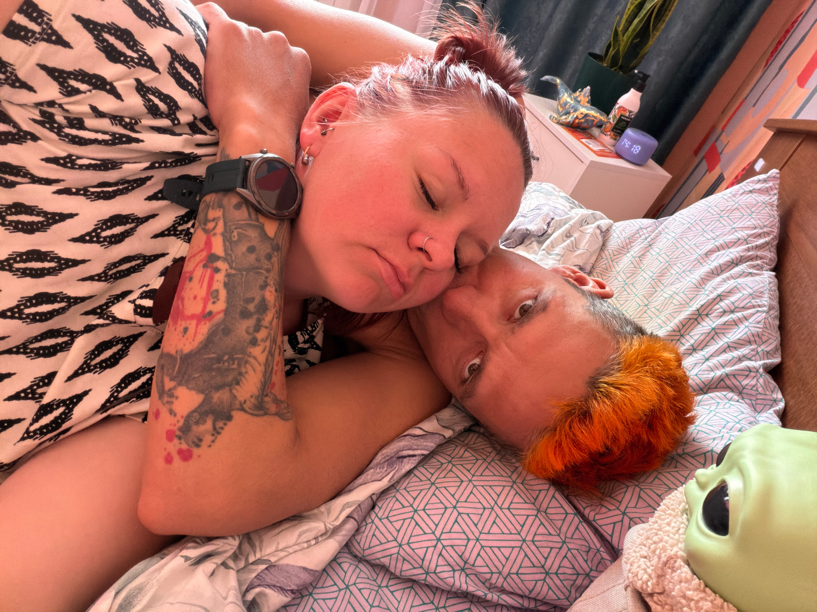 Two individuals are lying in bed, one appearing to kiss the other on the cheek. The individual kissing has orange hair and is looking at the camera. The other individual has red hair and their eyes arβ¦read more
