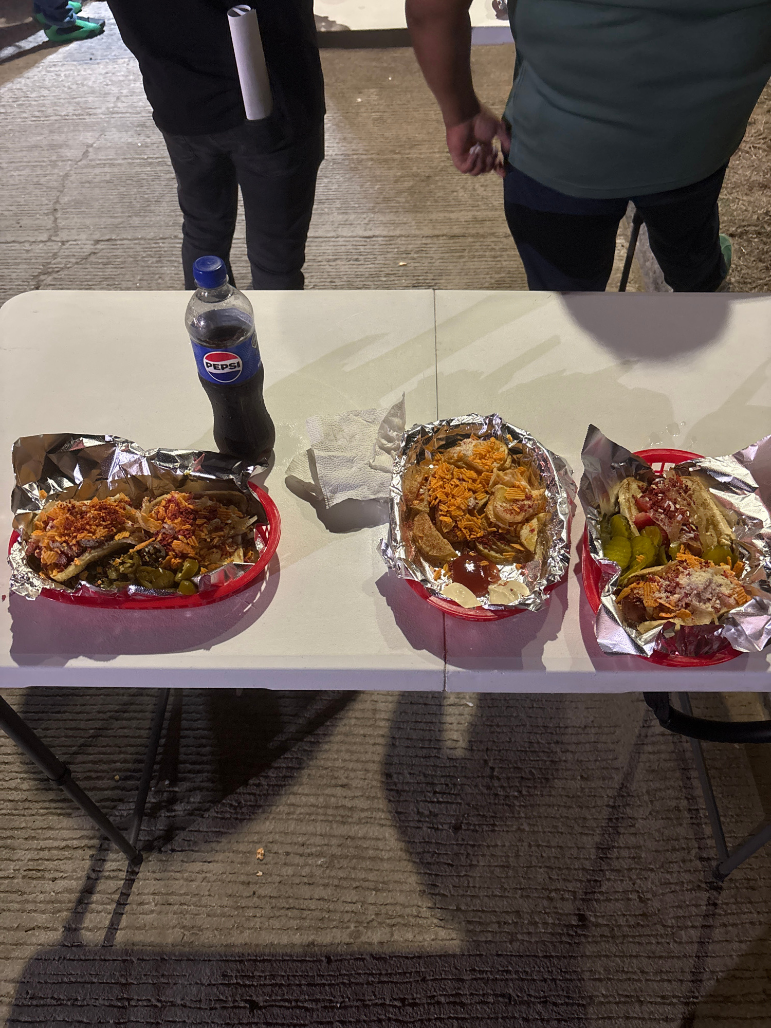 The image shows a table with food and drinks, likely in Tampico, Mexico. Three red baskets contain food wrapped in aluminum foil; two appear to be sandwiches or tacos with toppings like shredded chees…read more