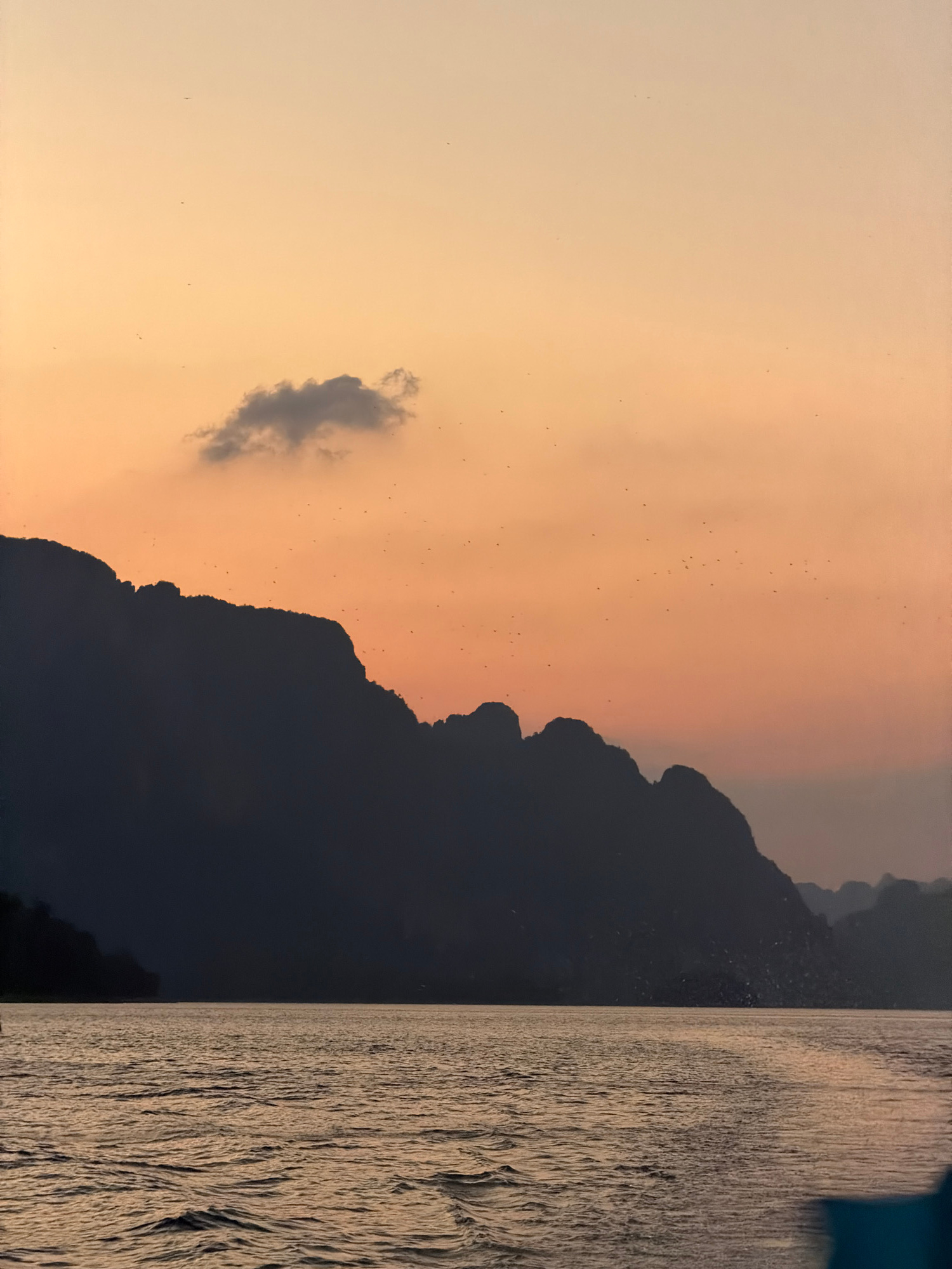 The image displays a dusk or sunset scene over a body of water in the vicinity of Ban Chiao Lan, Thailand. The lower half of the frame features a large expanse of rippling water, reflecting warm, gold…read more