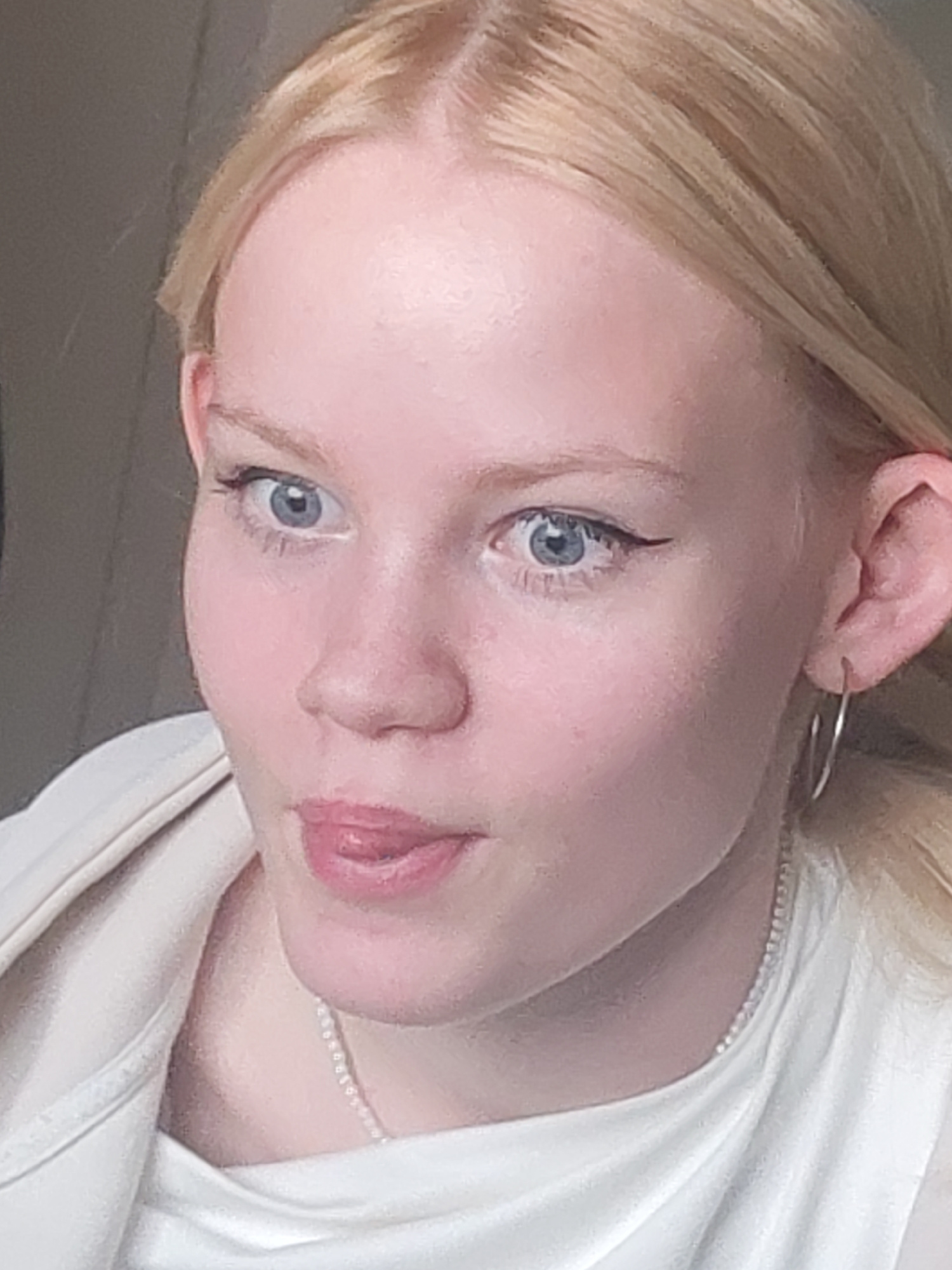 A close-up portrait of a young, fair-skinned female with blonde hair and light blue eyes. She is wearing eyeliner and small hoop earrings. A silver chain necklace is visible. Her mouth is slightly ope…read more