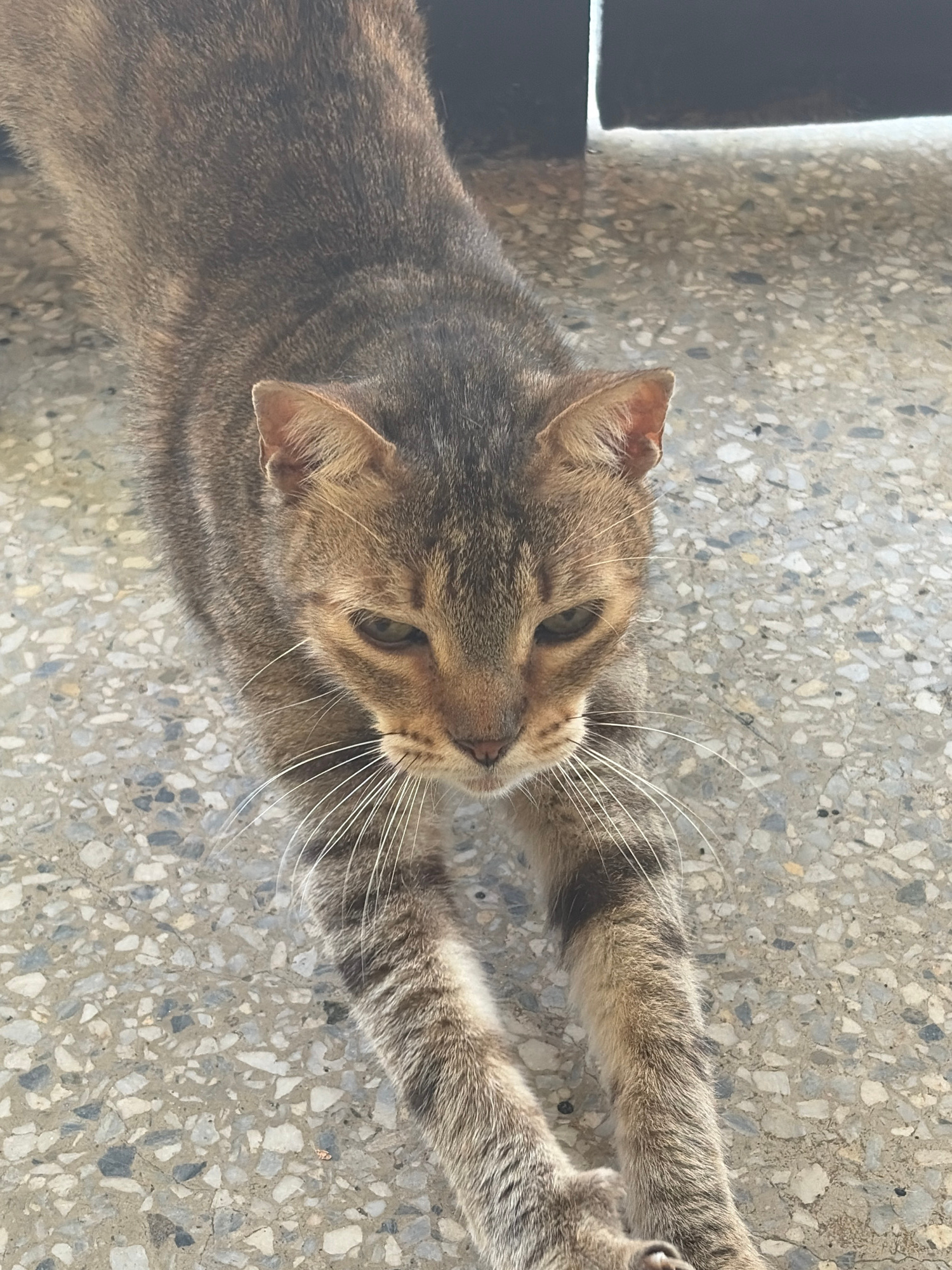 A tabby cat stretches on a concrete floor with a terrazzo pattern. The cat is facing upwards, with its forelegs extended. The background is out of focus. The location is unknown but alleged to be in C…read more