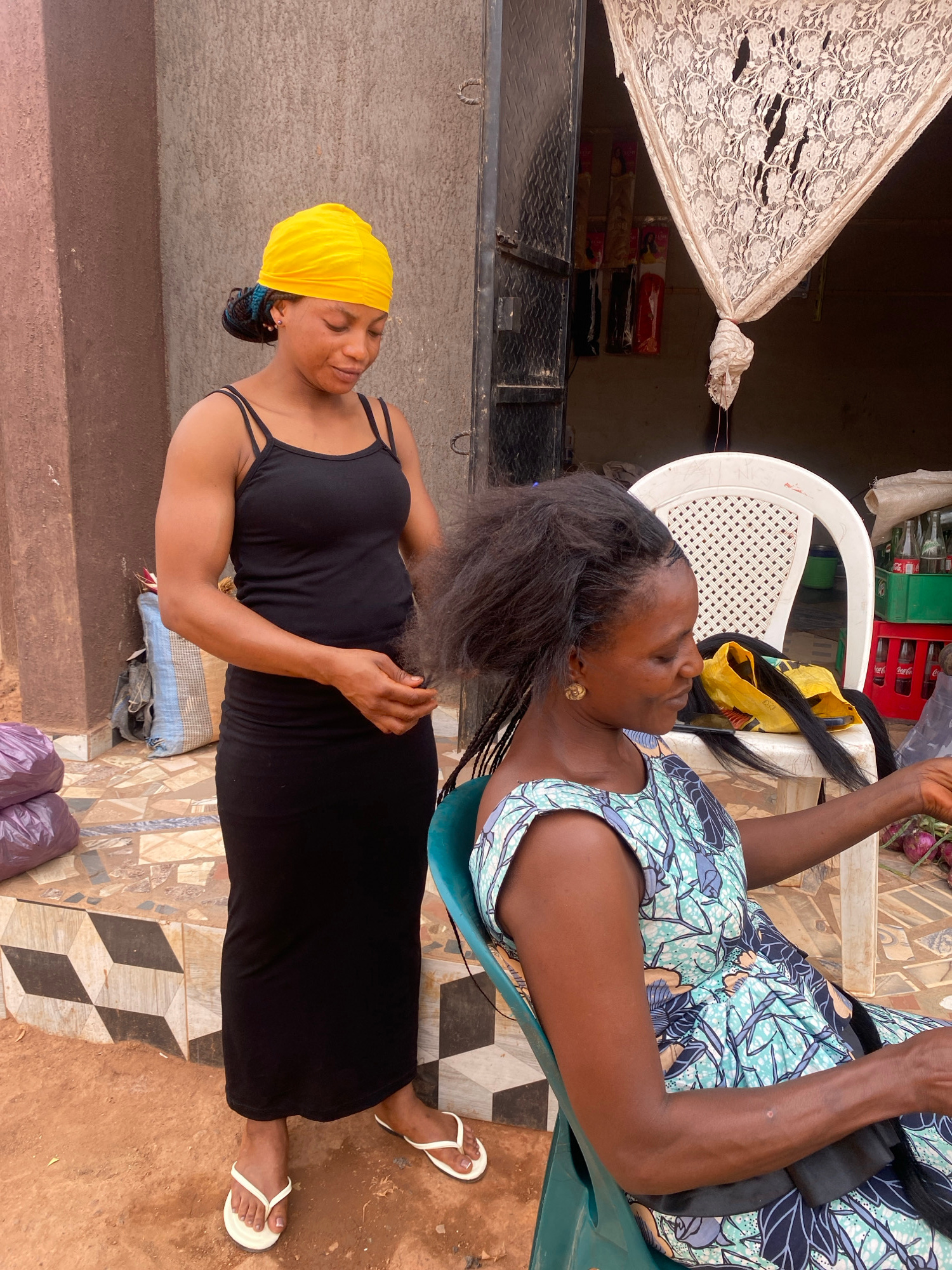 Two women are in an outdoor setting in Rido, Nigeria. One woman is seated on a white plastic chair. She wears a blue and green patterned top, has dark hair with braids, and is in the process of gettin…read more