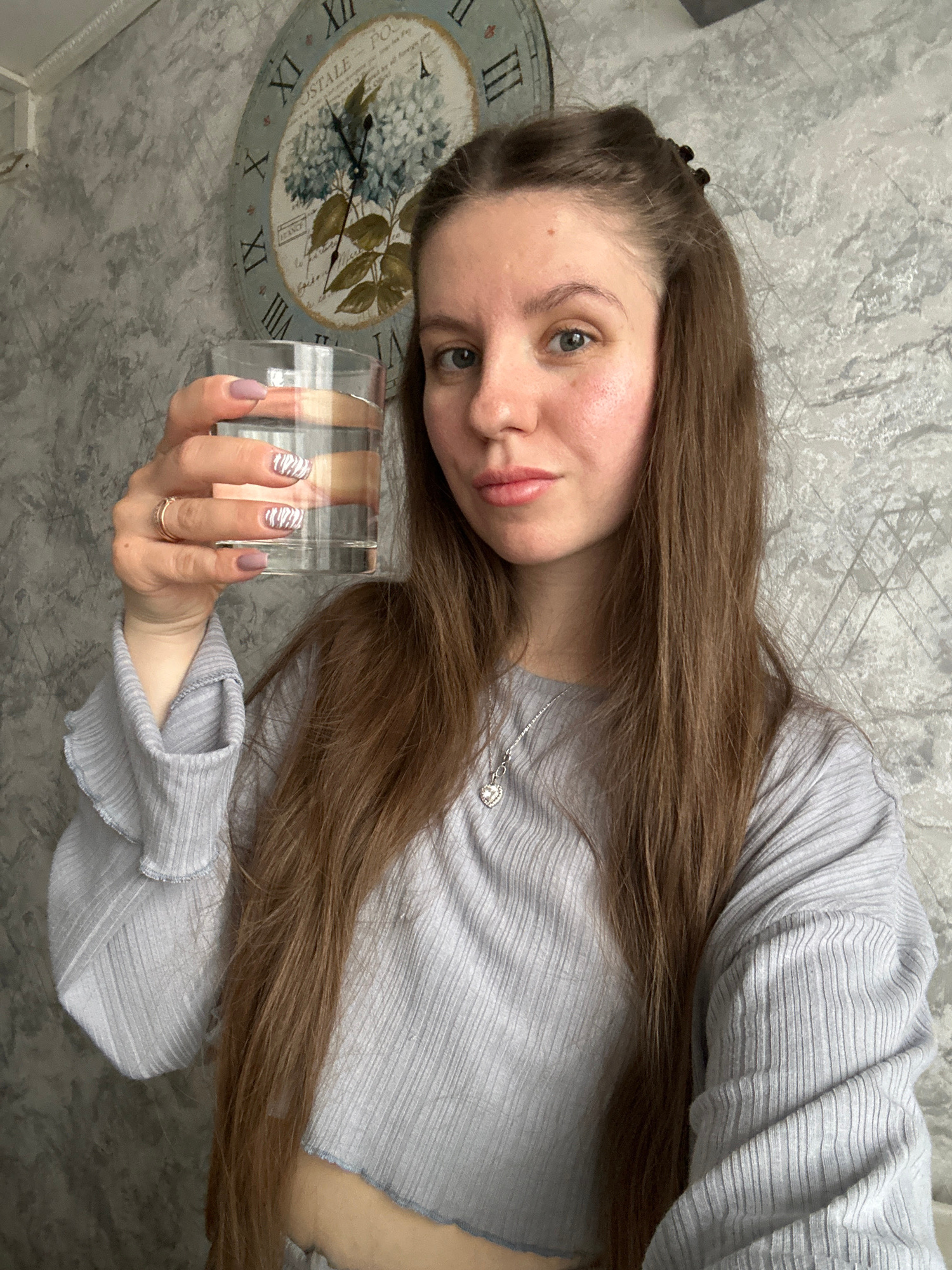 A woman with long, light brown hair, wearing a light blue ribbed shirt and a silver necklace, is holding a rectangular glass object with horizontal beige and brown stripes in her right hand. She has lā¦read more