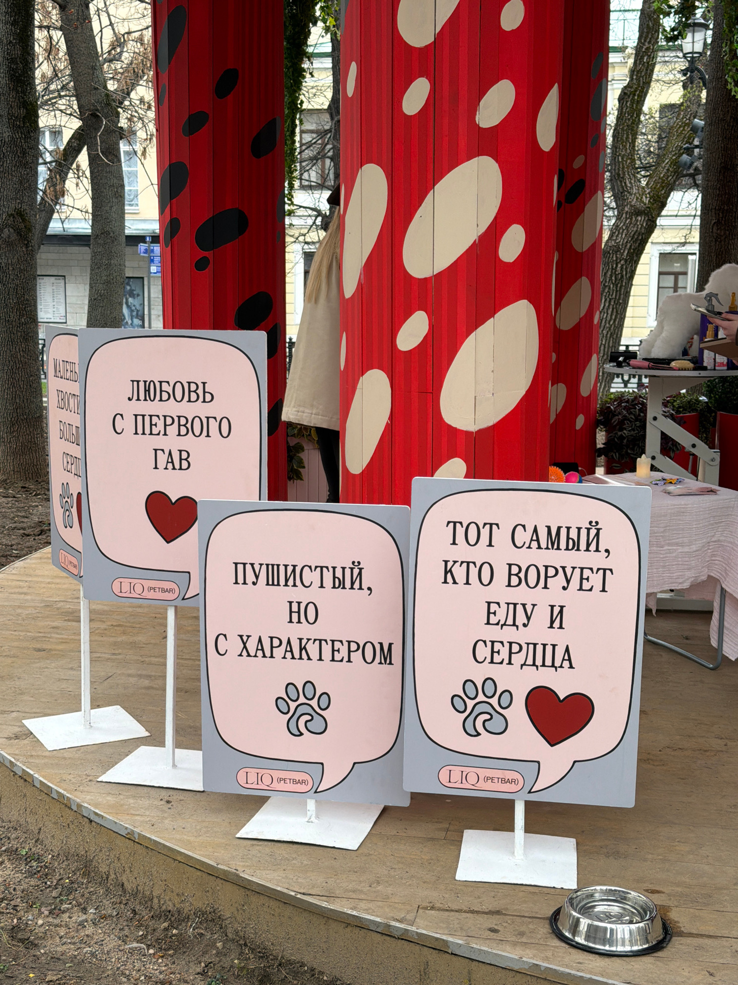 This outdoor photograph captures a scene likely from a pet-themed event or market in Moscow, Russia. The primary subjects are four freestanding, speech-bubble-shaped signs with affectionate and humoroβ¦read more