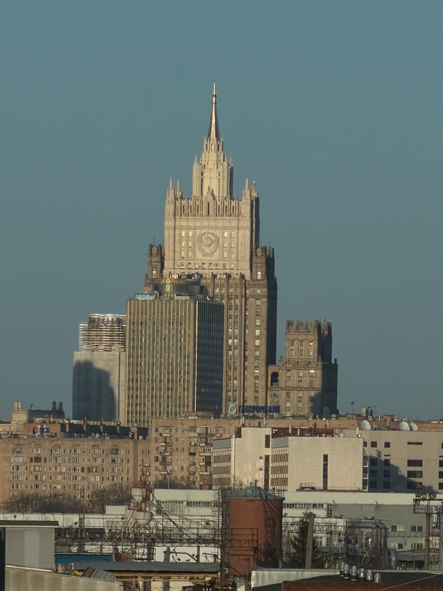 The image shows a cityscape in Moscow, Russia. The most prominent building is the Ministry of Foreign Affairs, one of the Seven Sisters skyscrapers built in the Stalinist architectural style. The buil…read more