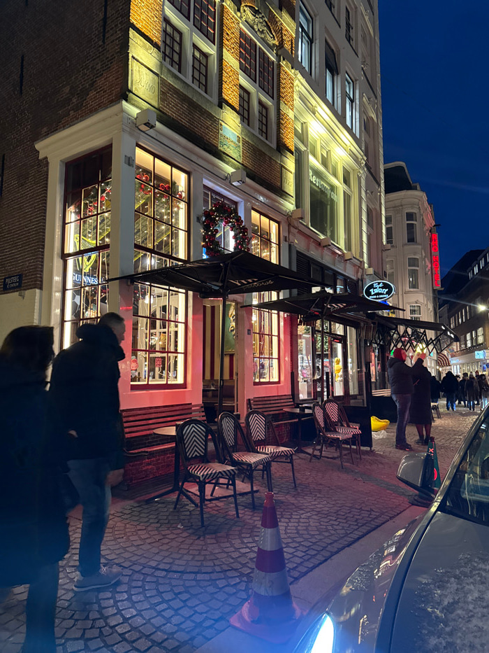 An evening street scene displays a building with lighted windows, some adorned with Christmas wreaths. A restaurant or bar's exterior has outdoor seating with black and white patterned chairs. People…read more