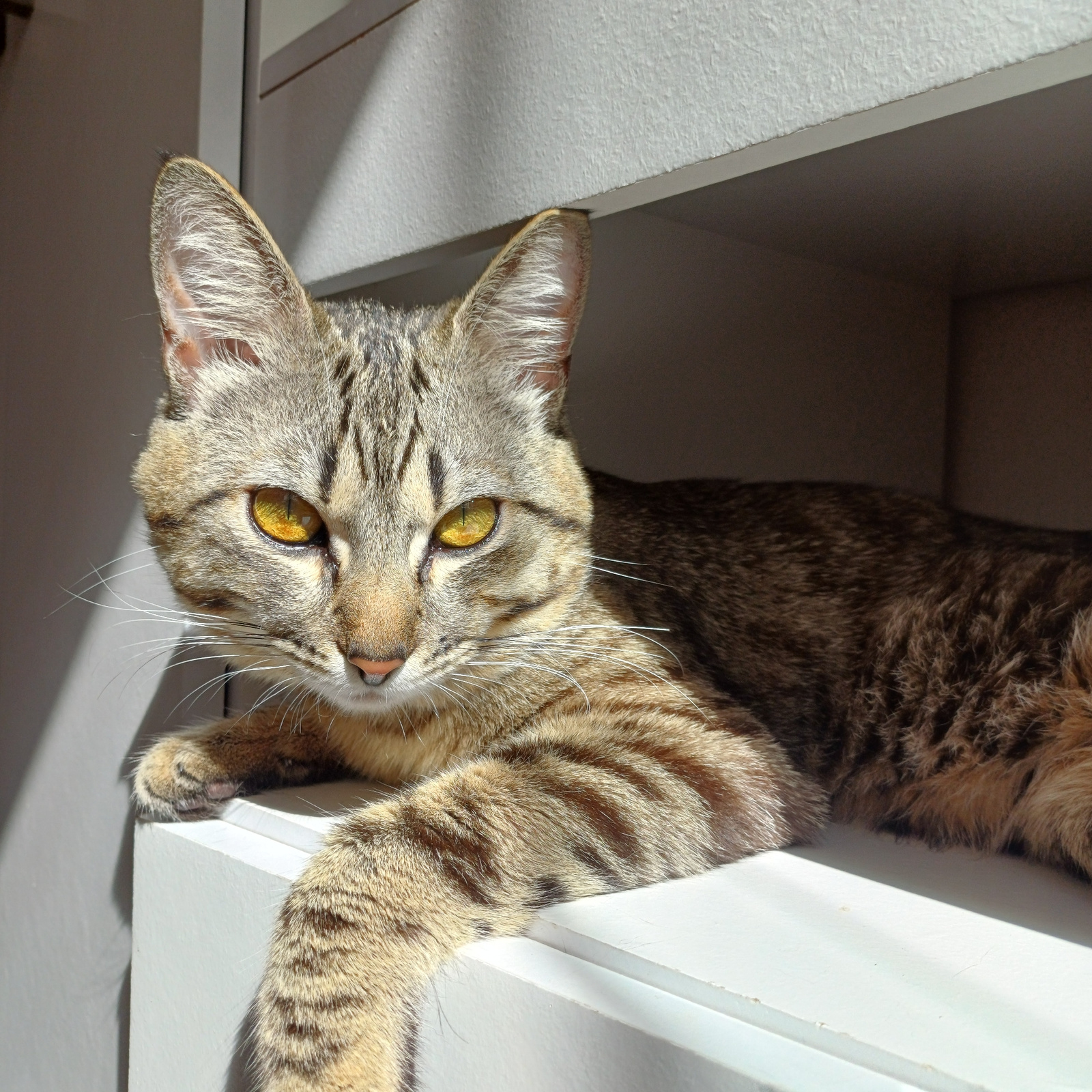 An upright close-up shot features a domestic short-haired tabby cat positioned upside down, gazing directly at the viewer. The cat's head is in the lower center of the frame, tilted slightly, with itsβ¦read more