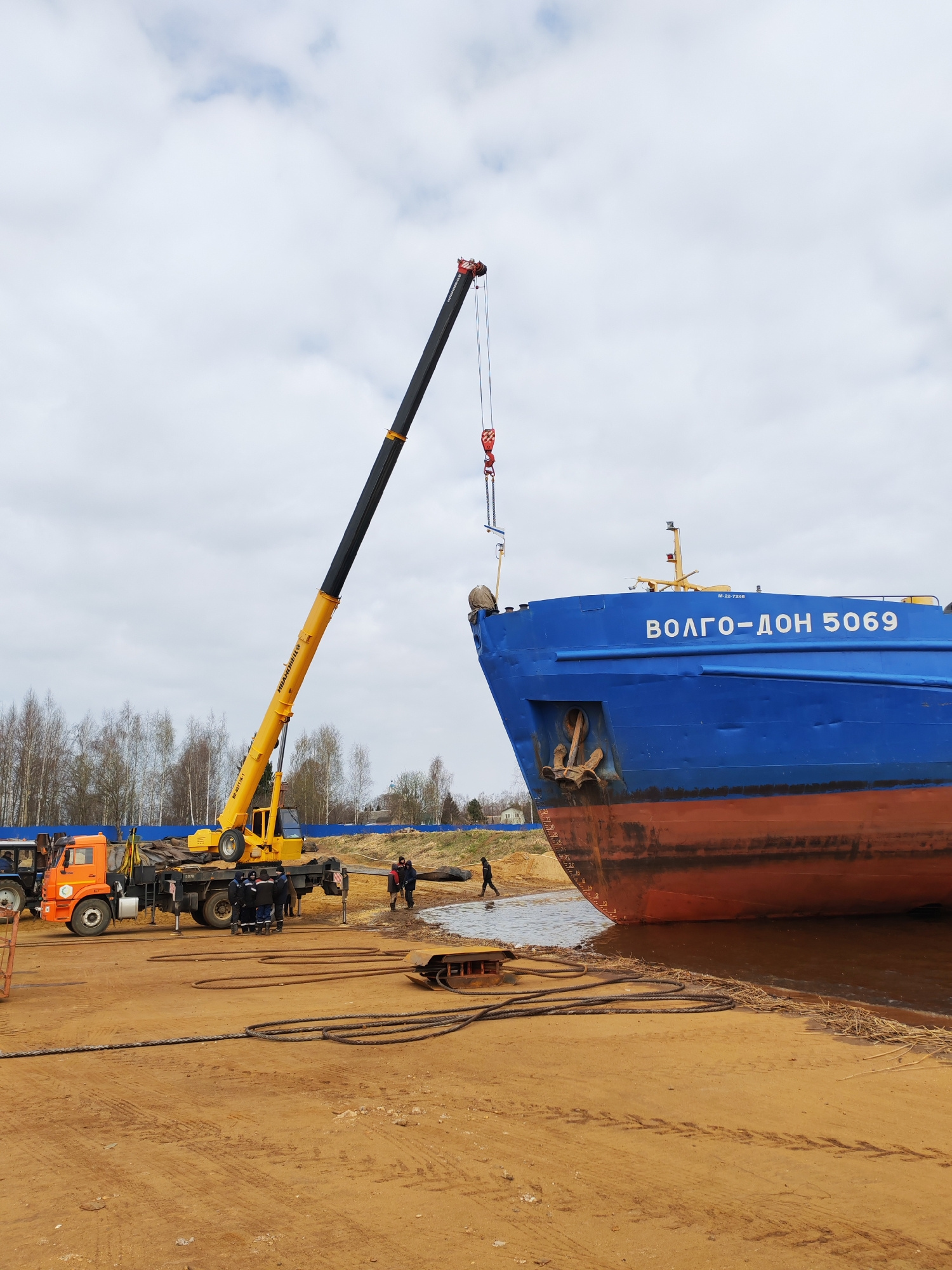 The image depicts an outdoor scene in Rybinsk, Russia, likely at a shipbuilding or repair yard. A large blue ship, identified as "ВОЛГО-ДОН 5069" (VOLGA-DON 5069) by the inscription on its bow, domina…read more