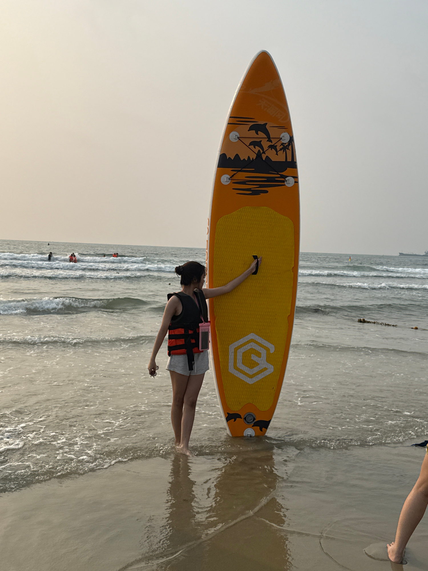 A person is lying horizontally on a beach next to a standup paddleboard. The person is wearing a black shirt, gray shorts, and a red life vest. The paddleboard is yellow with an orange perimeter and h…read more