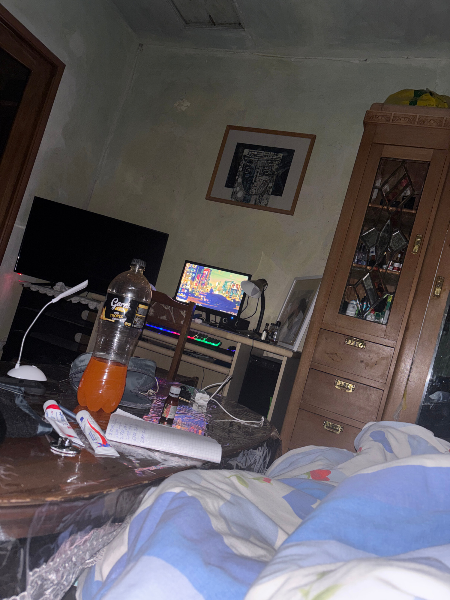 The image presents an indoor scene, likely a room within a residence. The presence of a television, computer monitor, and gaming peripherals suggests a recreational or gaming space. On the right side…read more