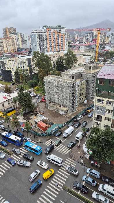 This high-angle urban landscape image depicts an intersection and surrounding developments in Batumi, Georgia, under an overcast sky. The road surfaces are wet, displaying white pedestrian crosswalk m…read more